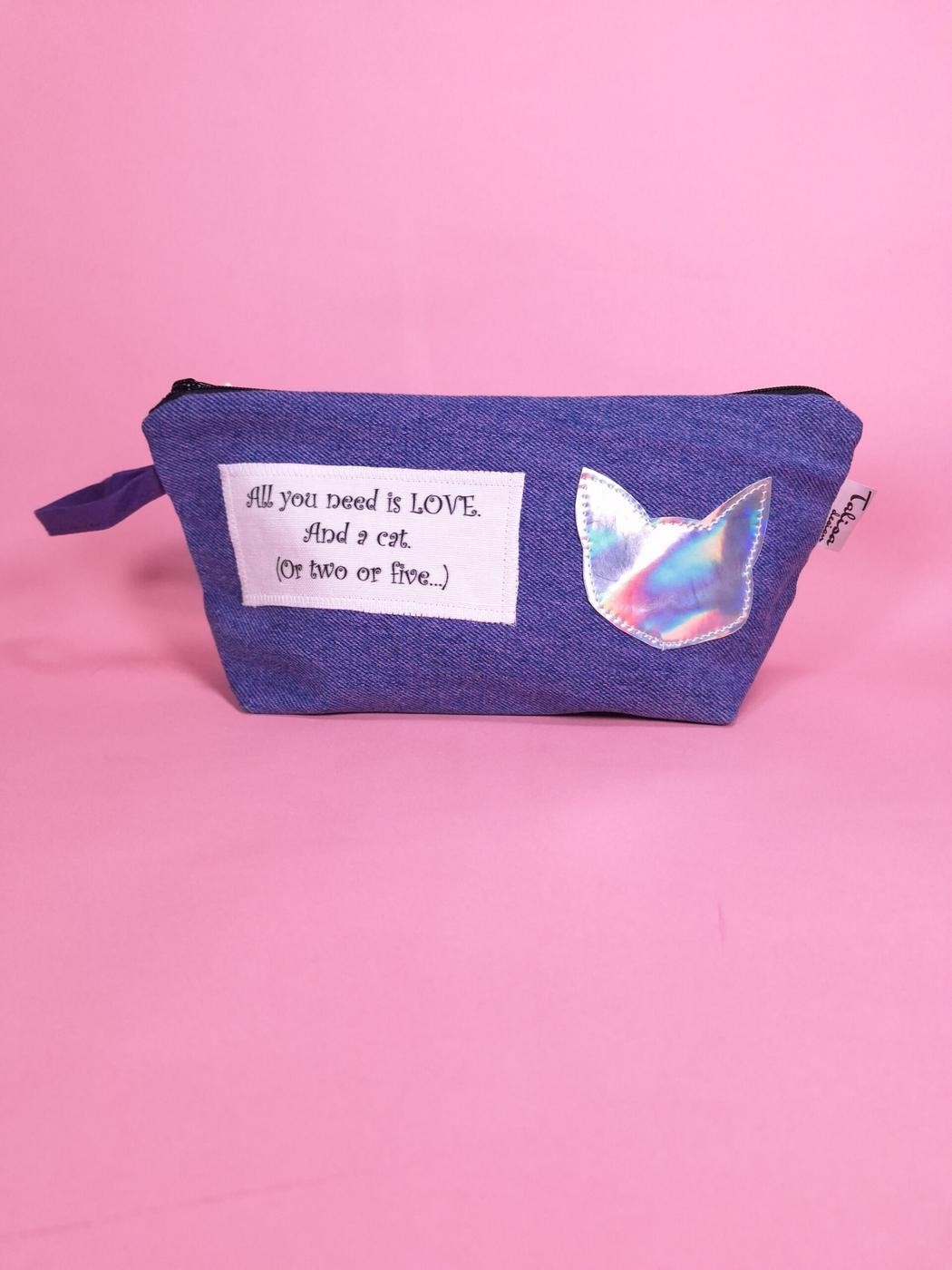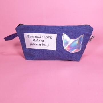 • Päällinen: Violetiksi värjättyä kierrätysfarkkua, johon on päällitikattu kisunpää hologrmammi tekonahasta sekä teksti “All you need is LOVE. And a cat. (Or two or five…).