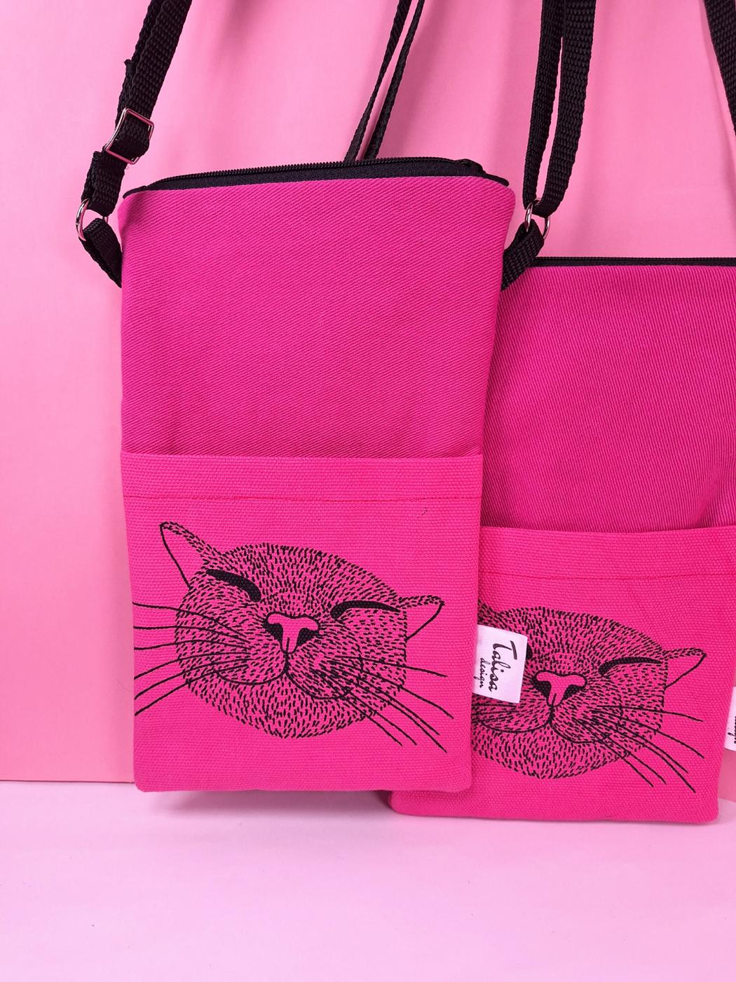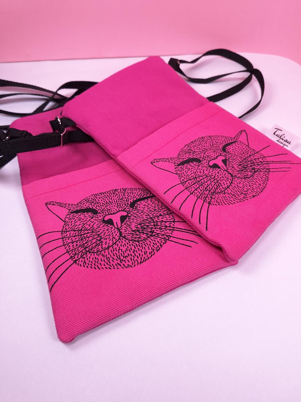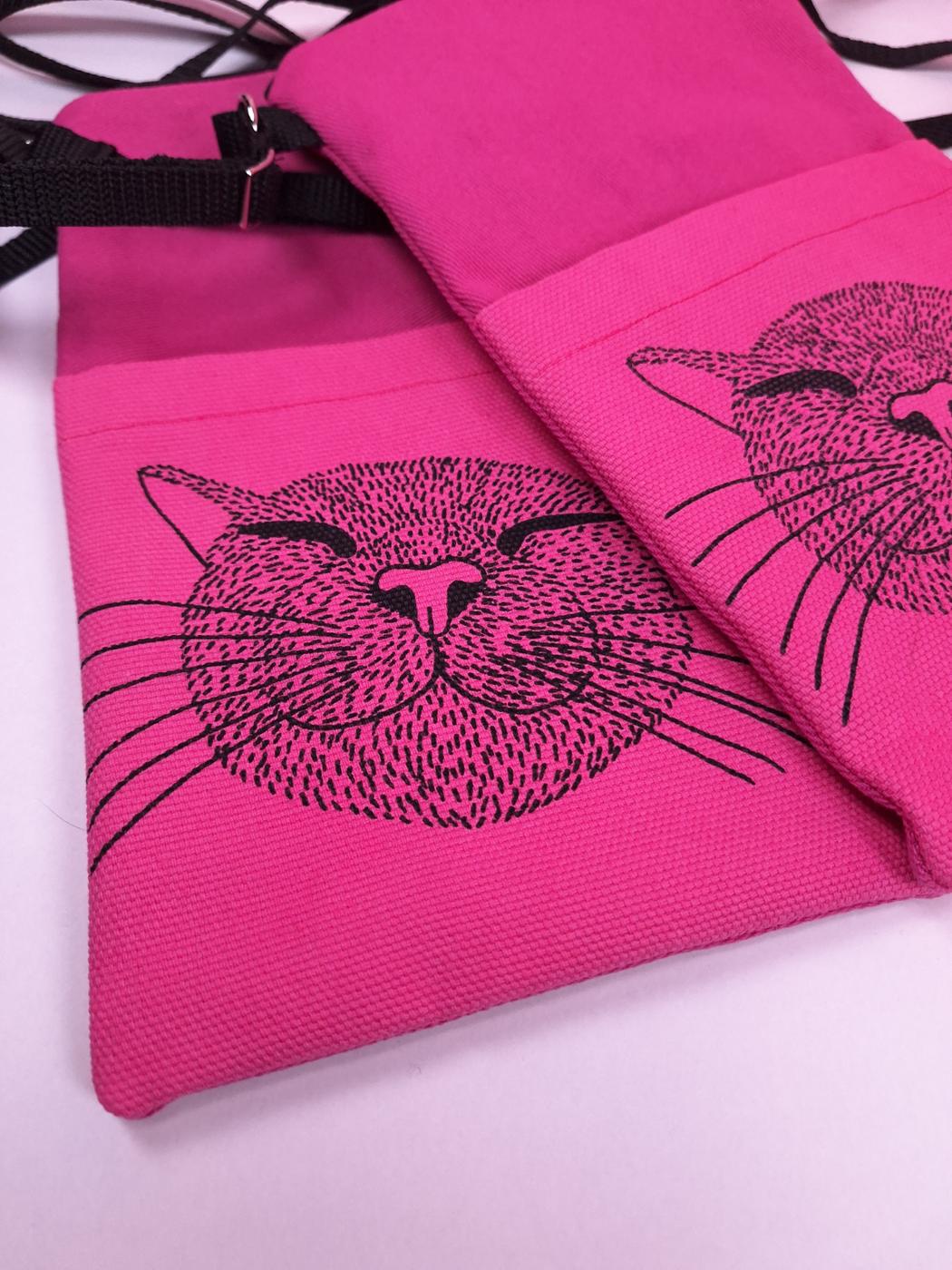 Happy Kitty -kännykkälaukku, kierrätysfarkkua Päällinen vaaleanpunaiseksi värjättyä kierrätysfarkkua Vuorikangas kierrätyspuuvillaa Sivutasku vaaleanpunaiseksi värjättyä paksua puuvillaa johon kuvio painettu Koko 14,5 x 24cm vetoketjun pituus 13cm Hihna pisimmillään 150cm