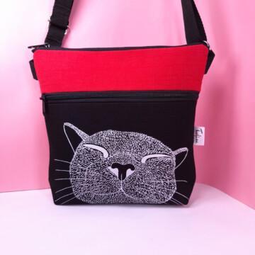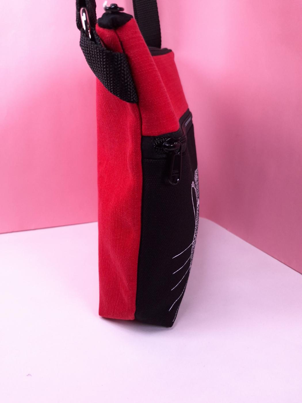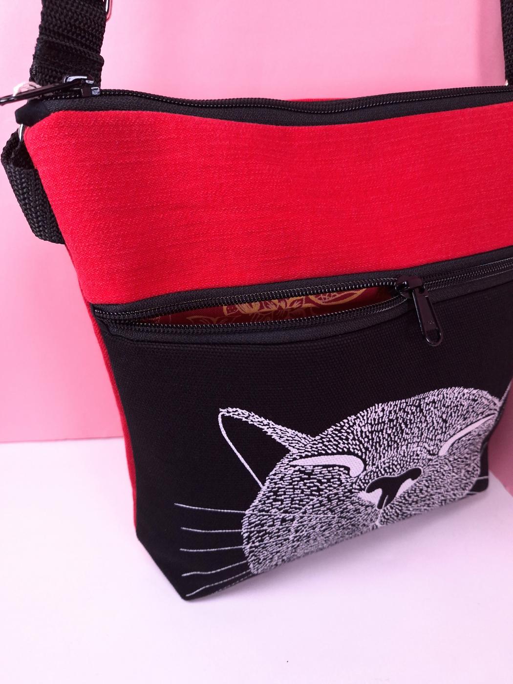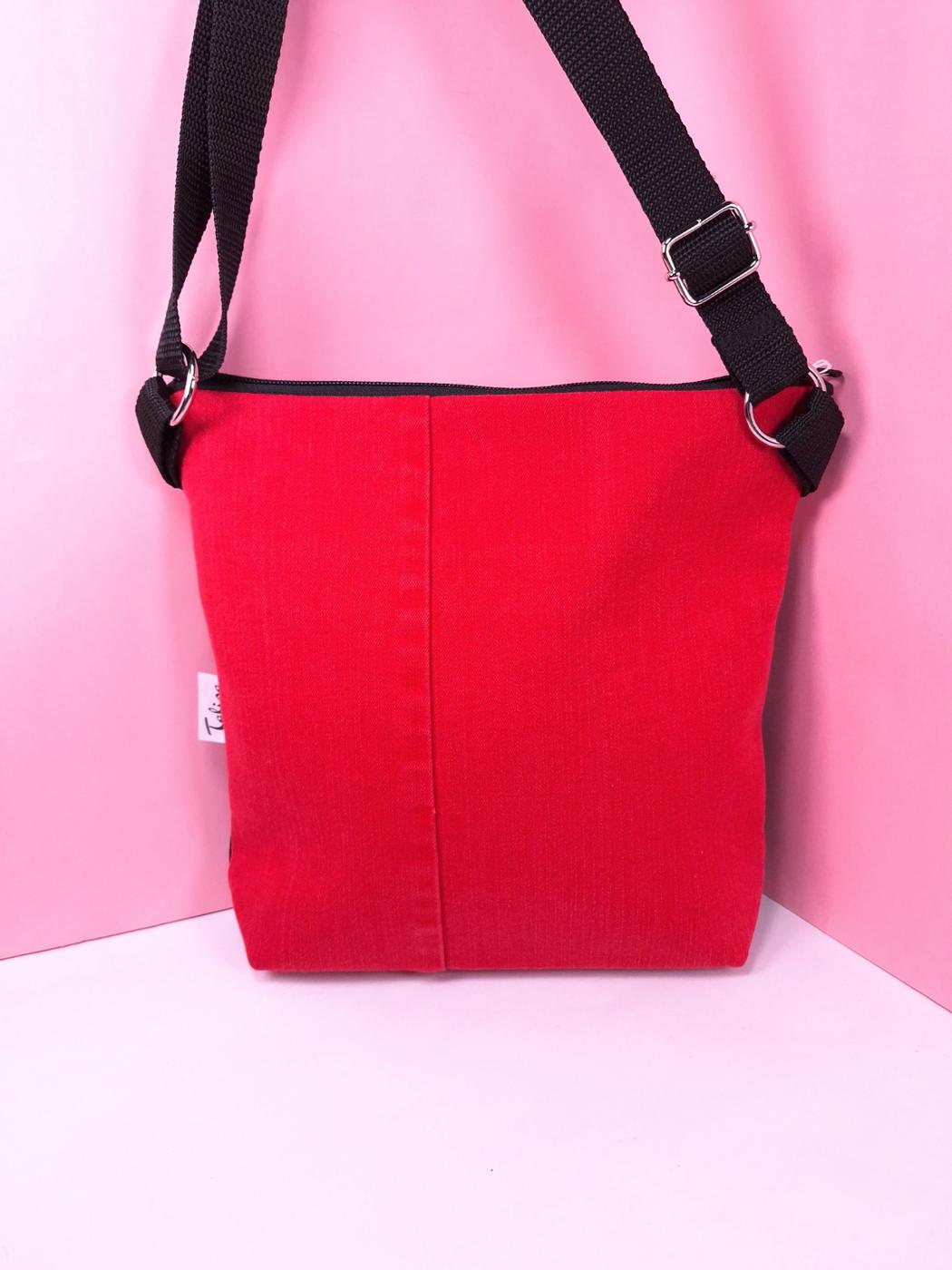 Laukun sivutaskuun on käsin painettu kuvio kankaanpainoväreillä.