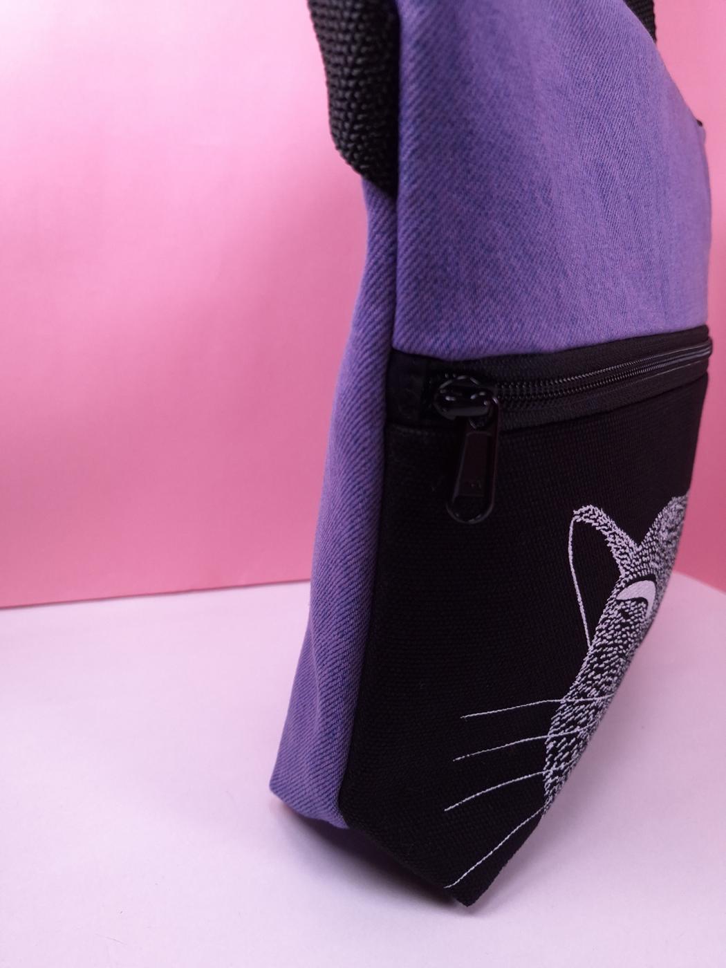 Laukun sivutaskuun on käsin painettu kuvio kankaanpainoväreillä.