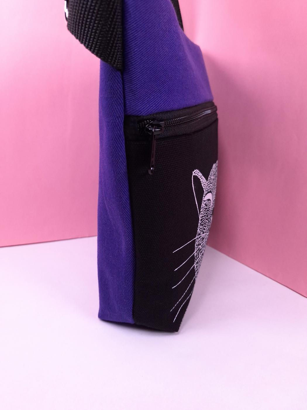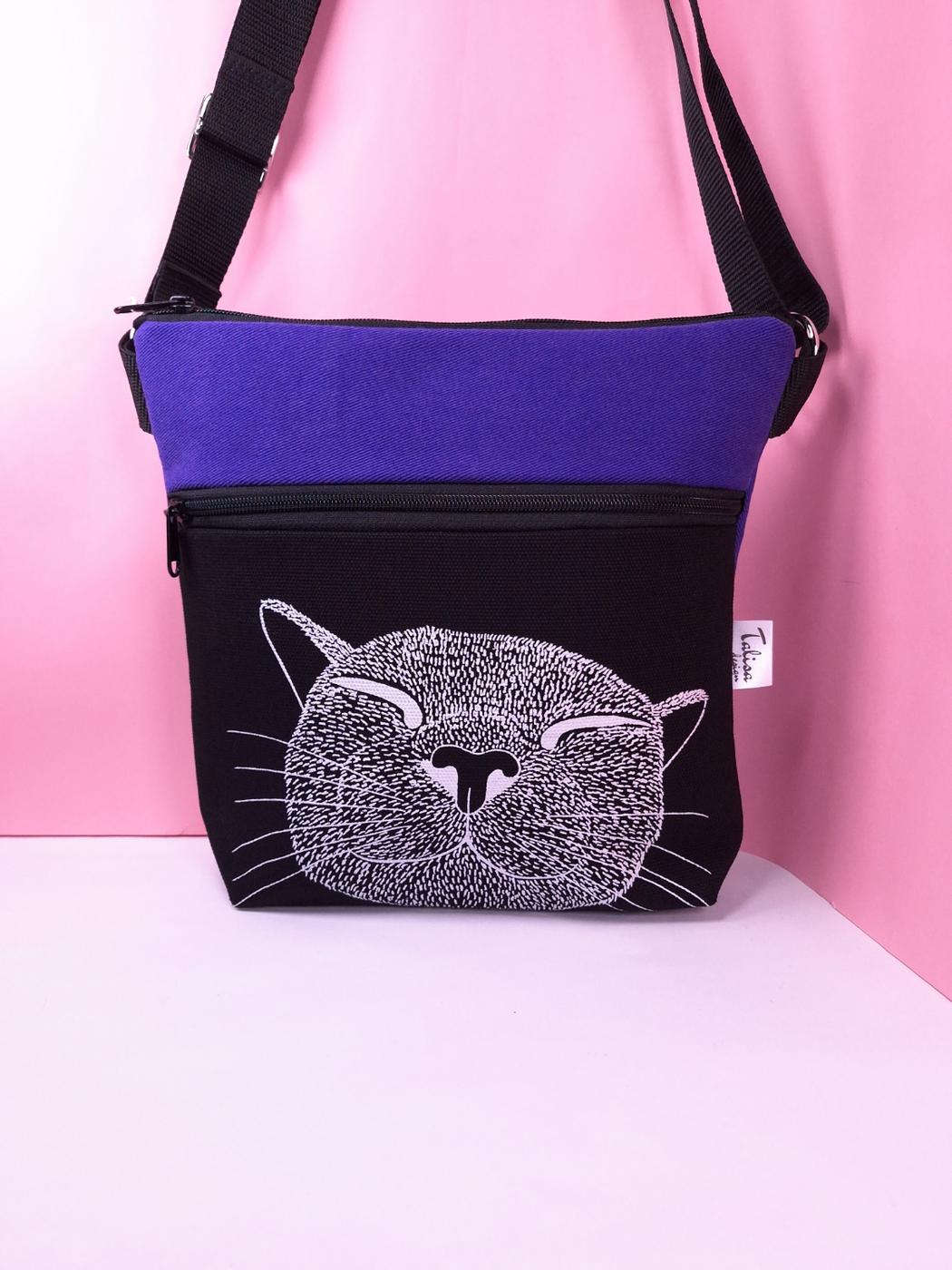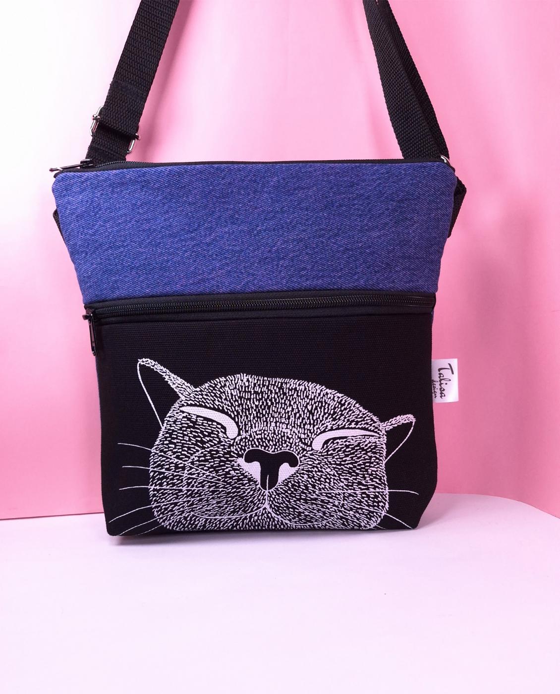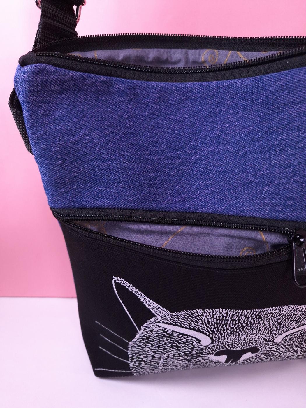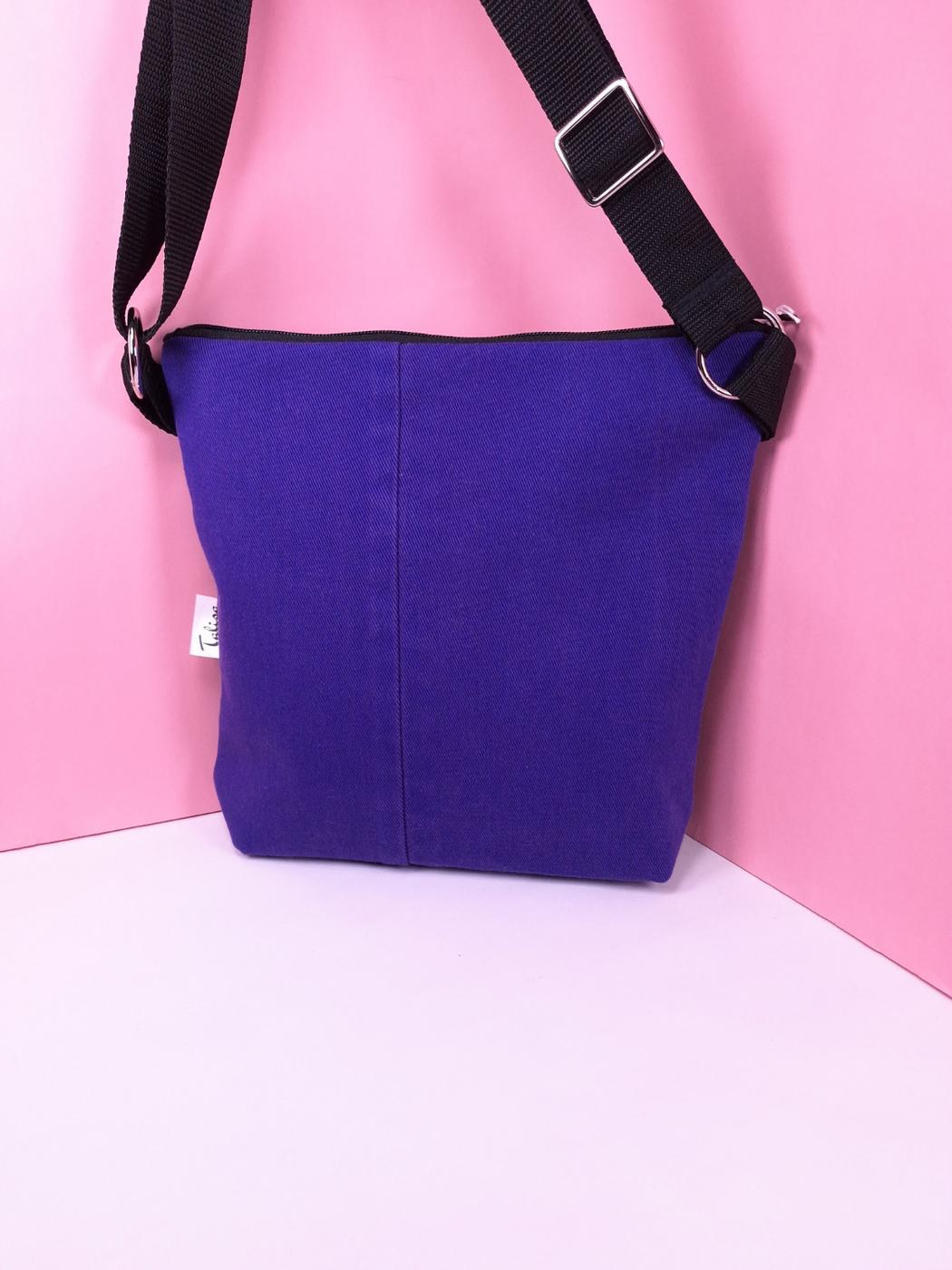 Laukun sivutaskuun on käsin painettu kuvio kankaanpainoväreillä.
