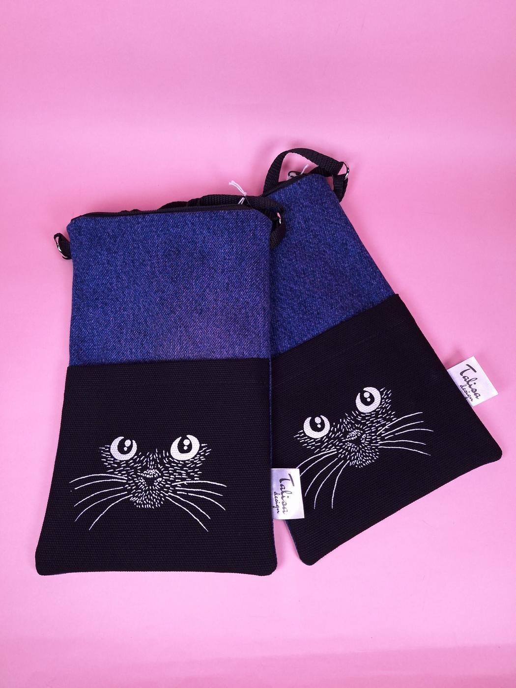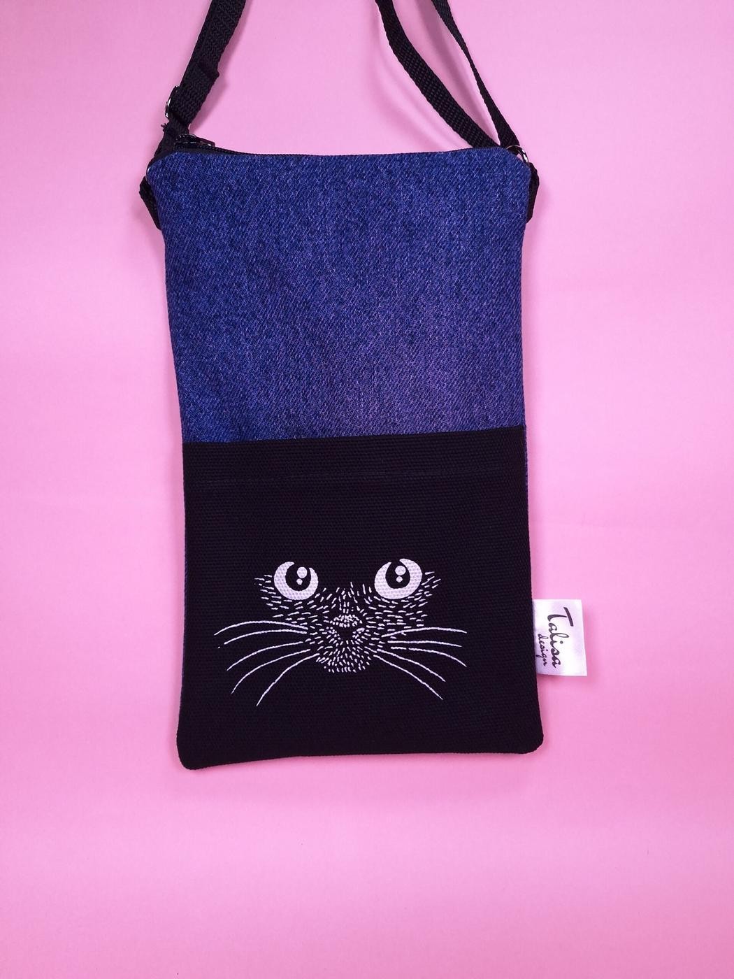 Sivutasku paksua mustaa puuvillaa johon kuvio painettu.