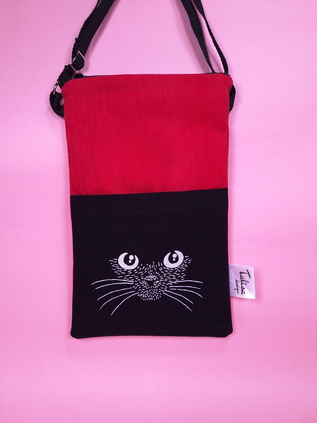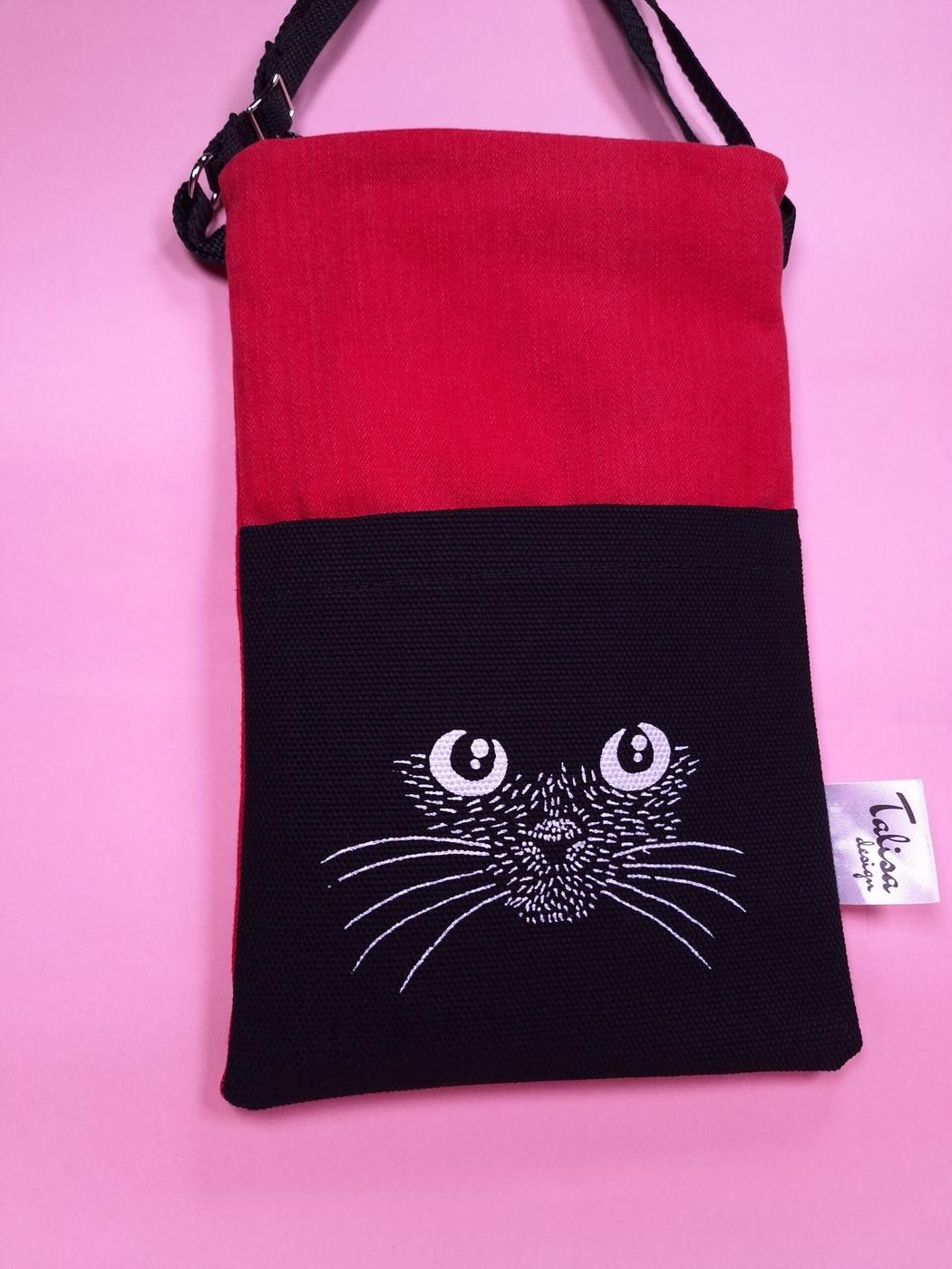 Sivutasku paksua mustaa puuvillaa johon kuvio painettu.