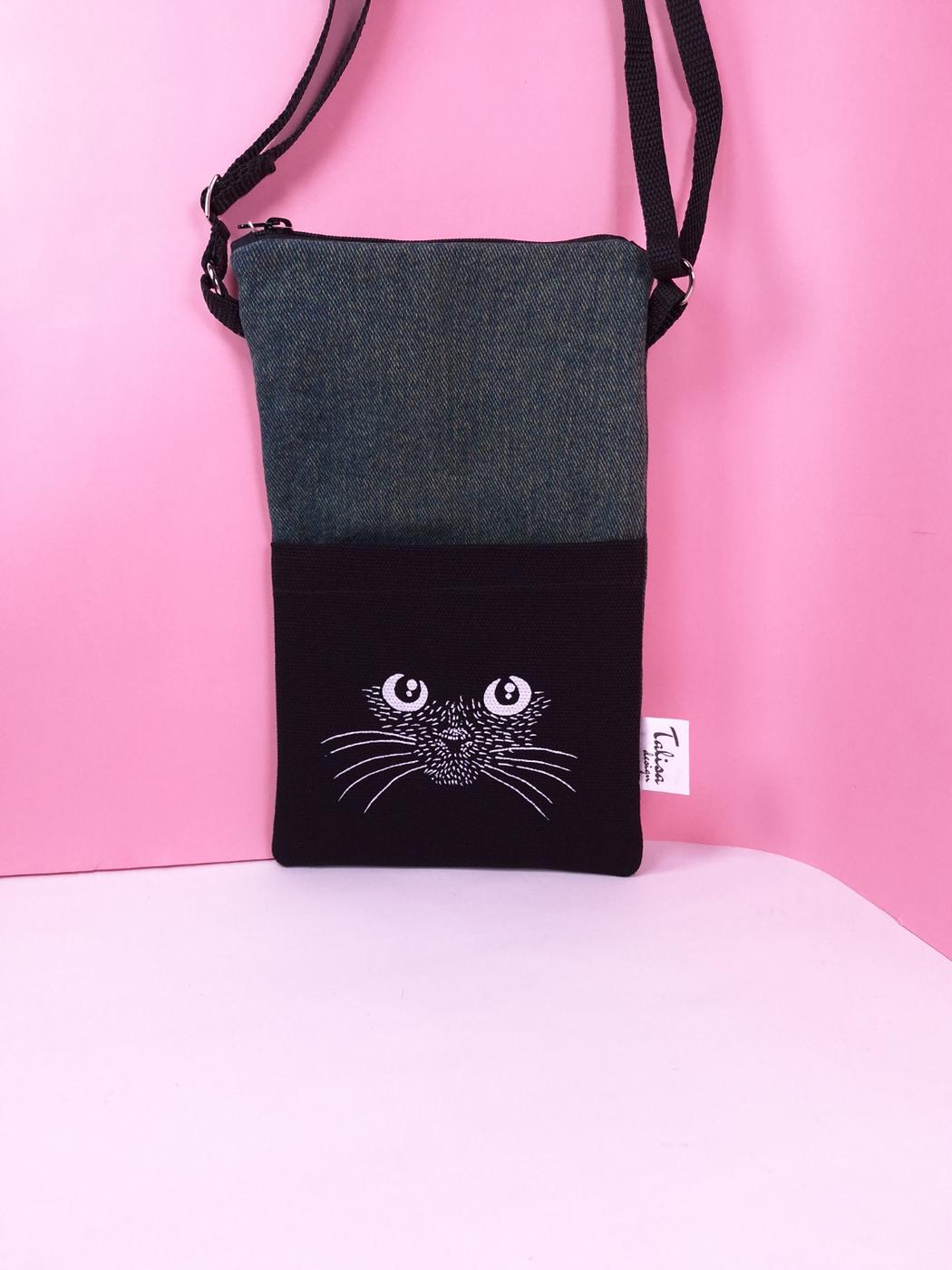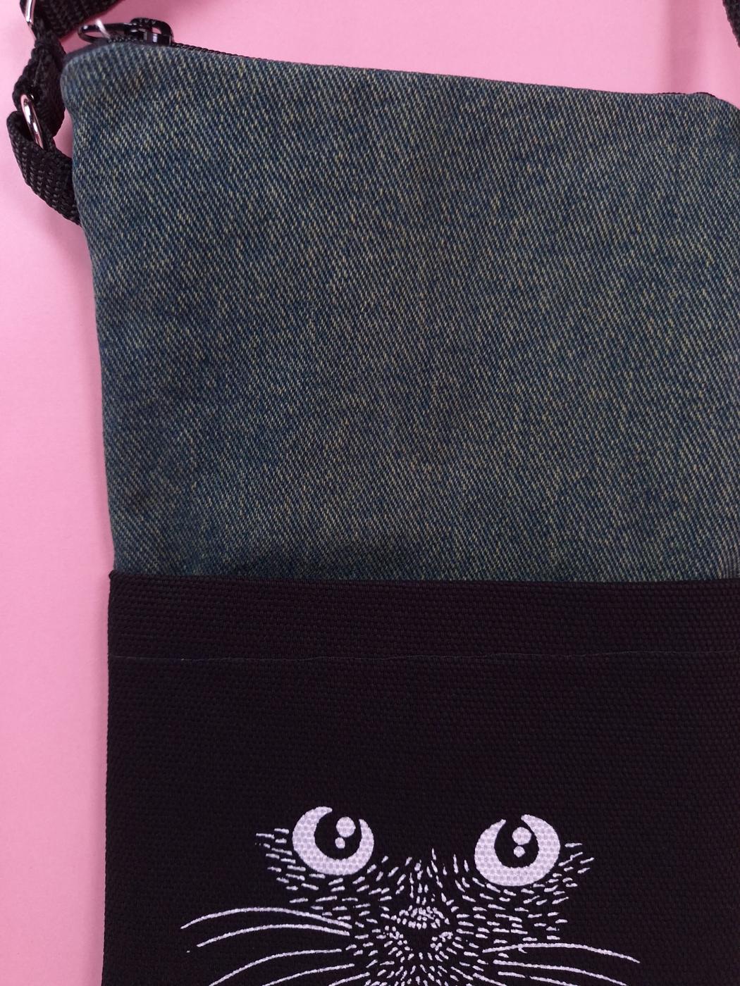 Kasvot pimeässä -kännykkälaukku, kierrätysfarkkua