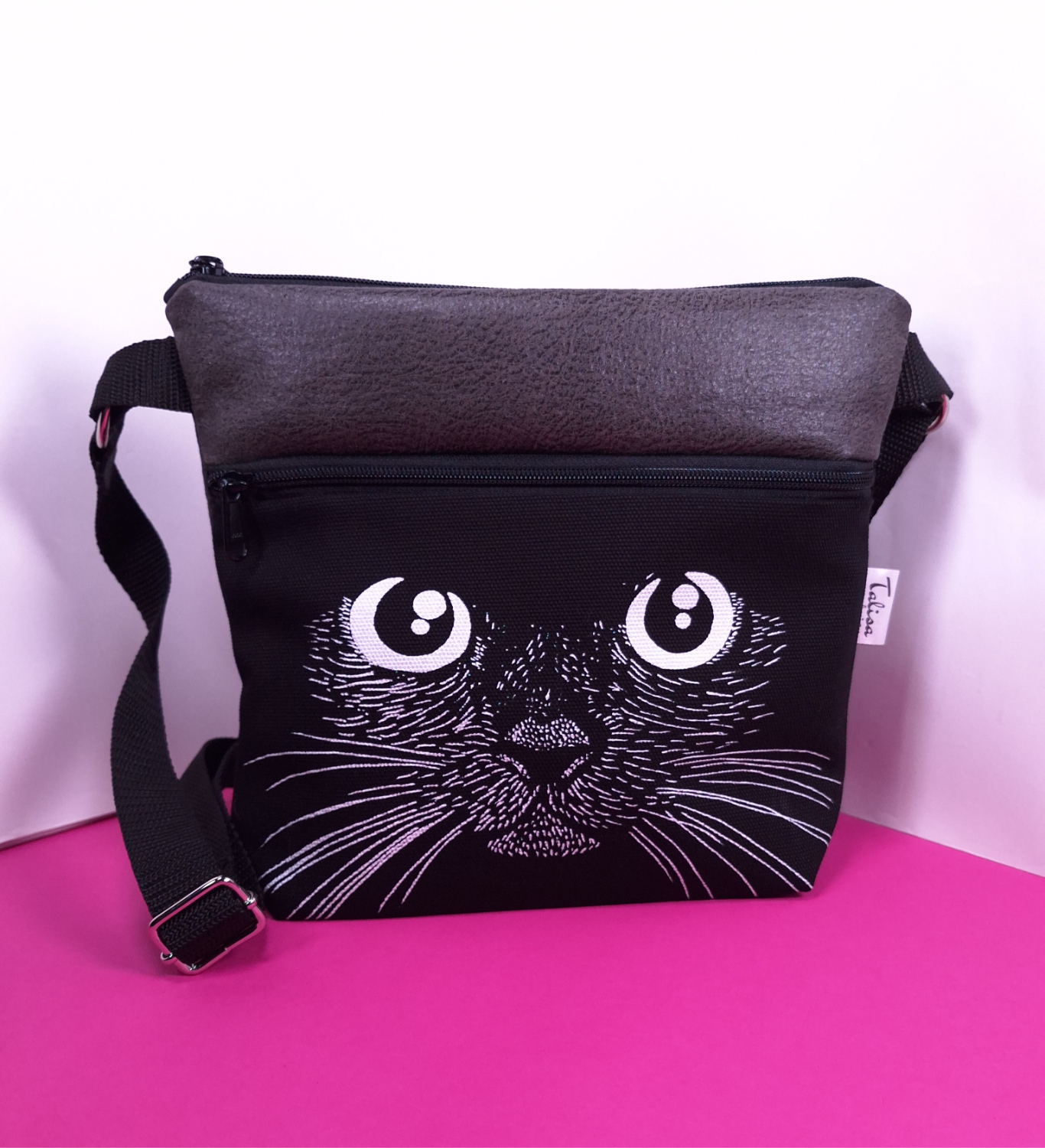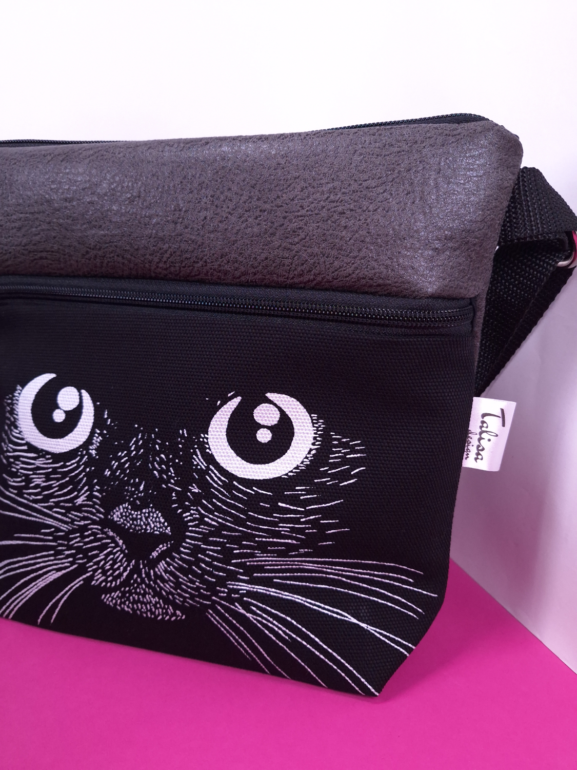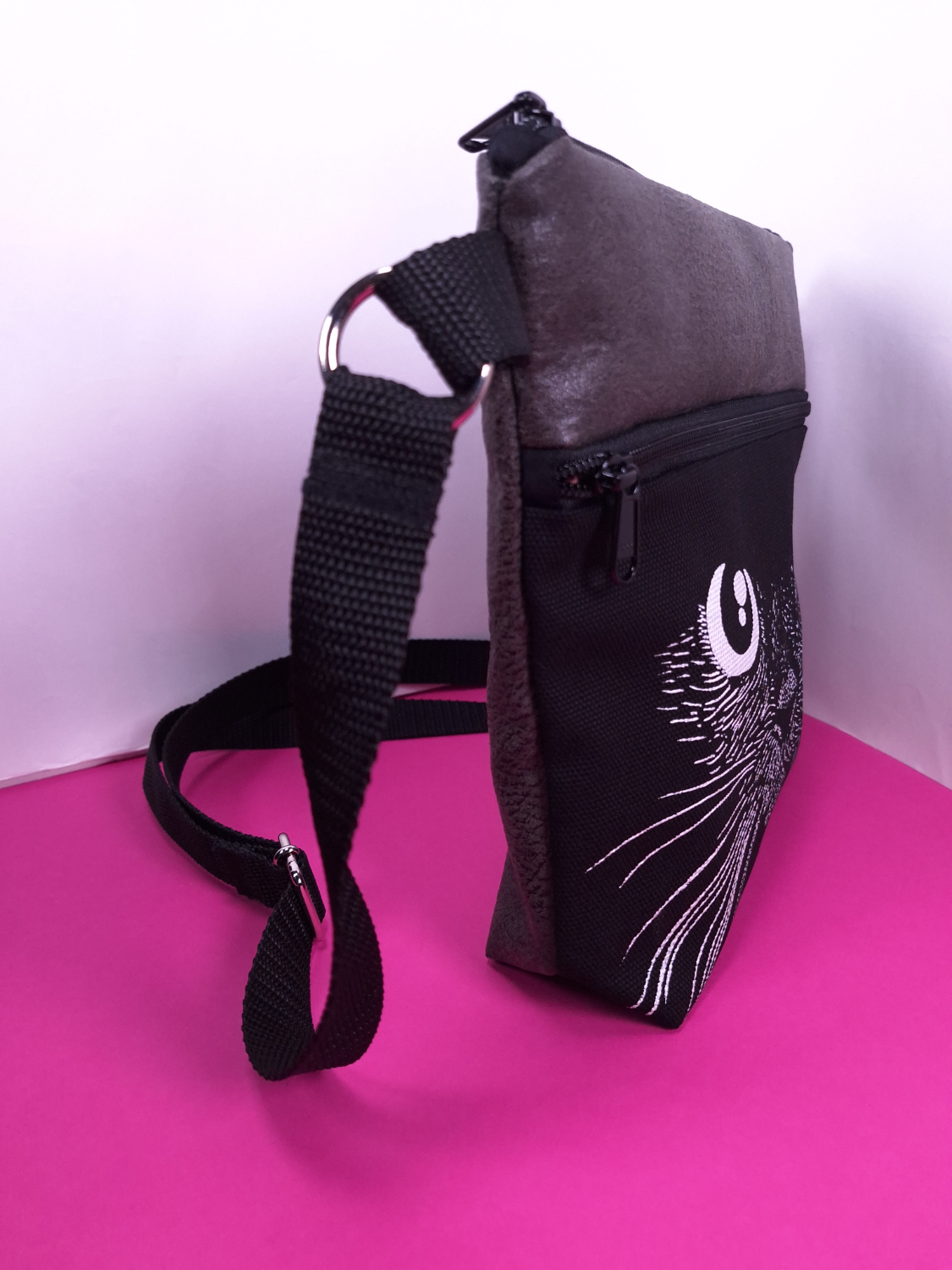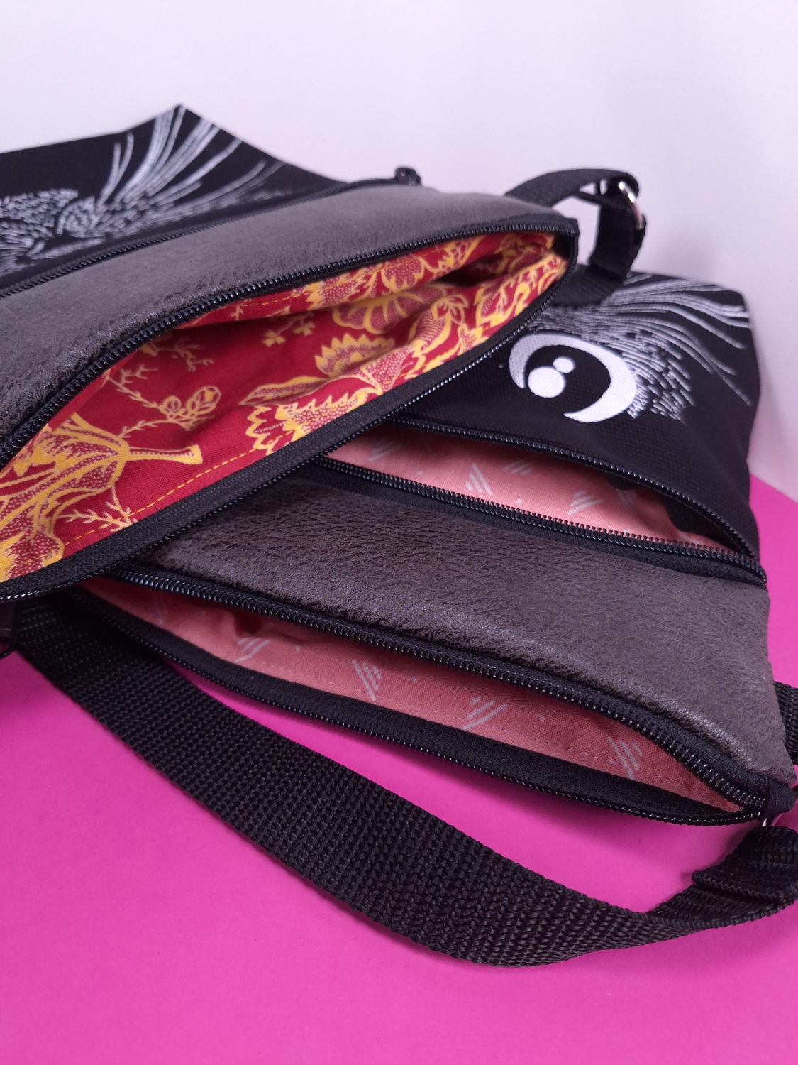 Laukun sivutaskuun on käsin painettu kuvio kankaanpainoväreillä.