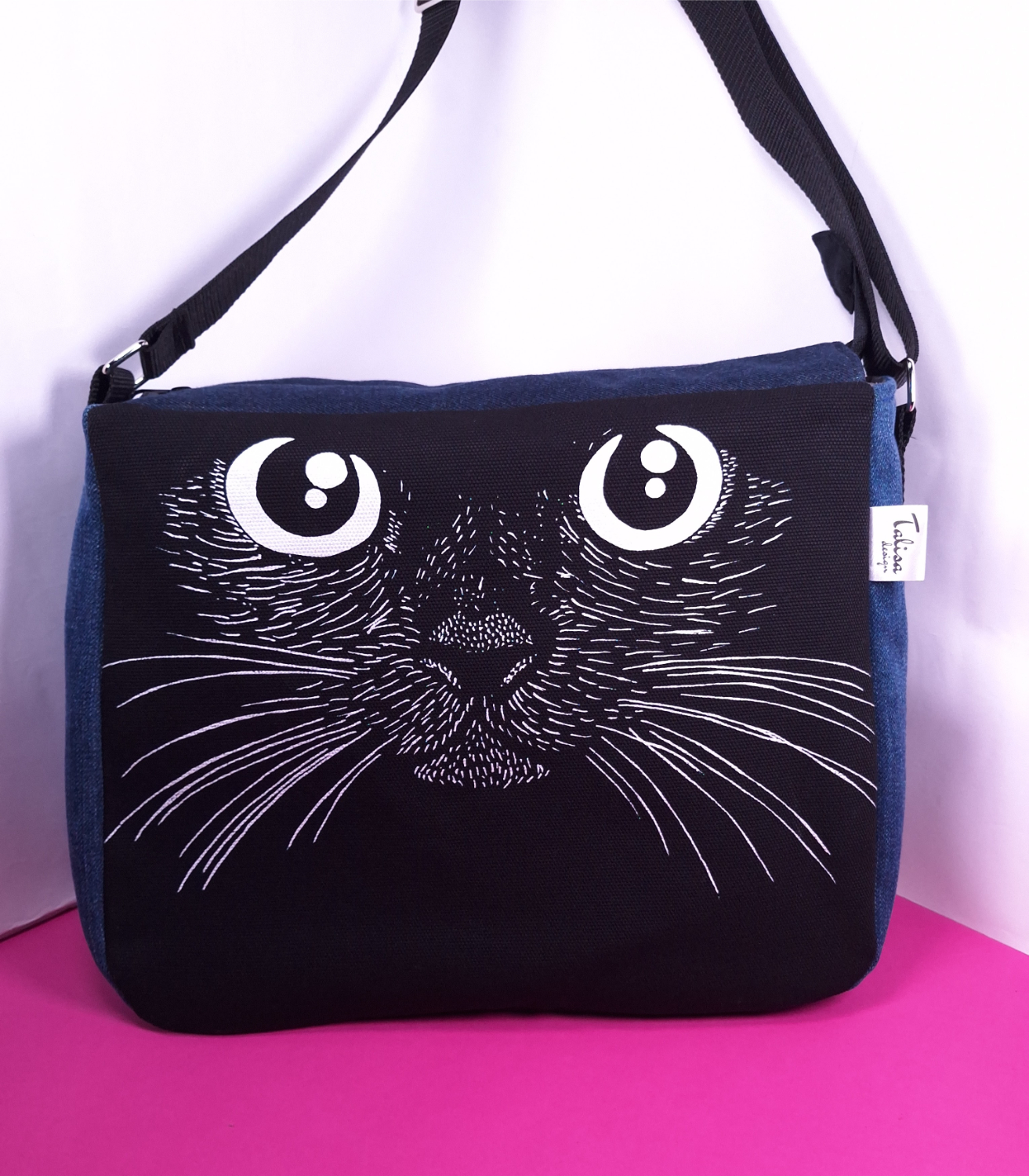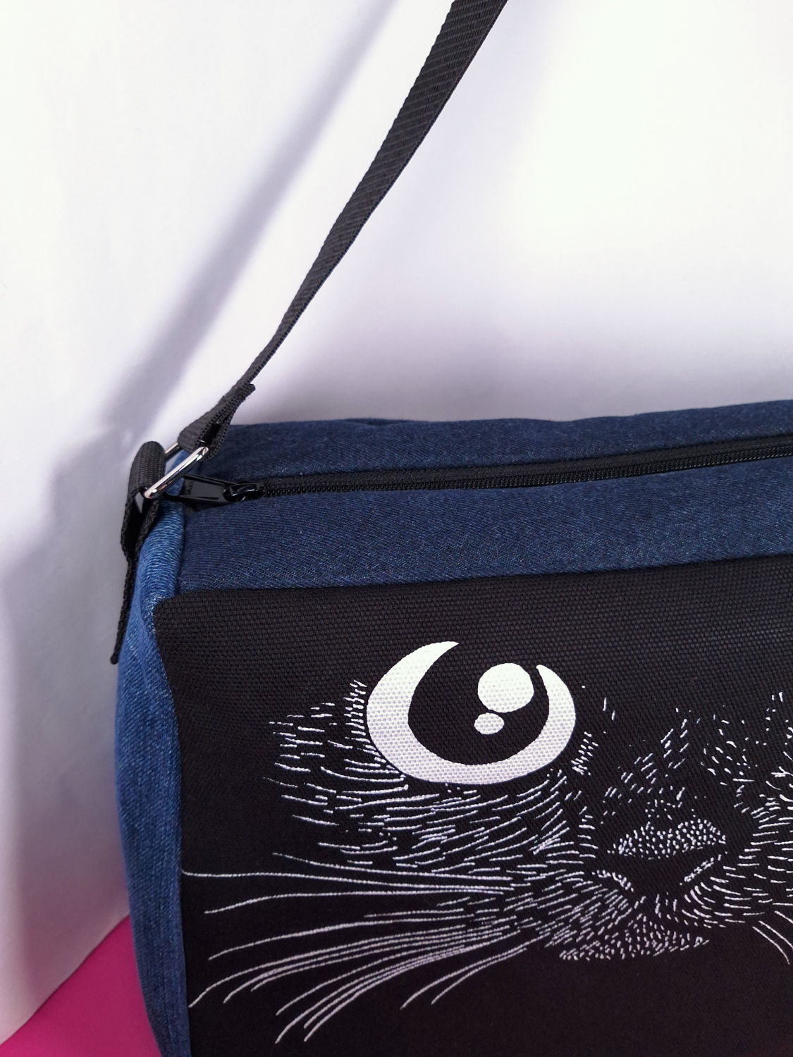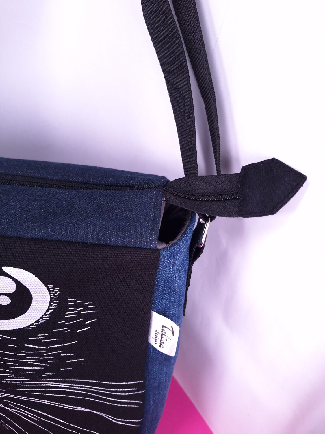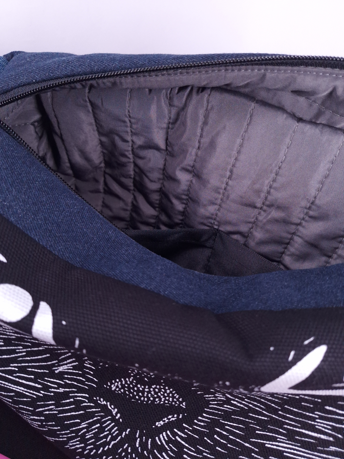 Laukun sisällä on kaksi sivutaskua. Laukun kylkeen mustaan puuvillaan on käsin painettu kuvio valkealla helmiäiskangasvärillä.