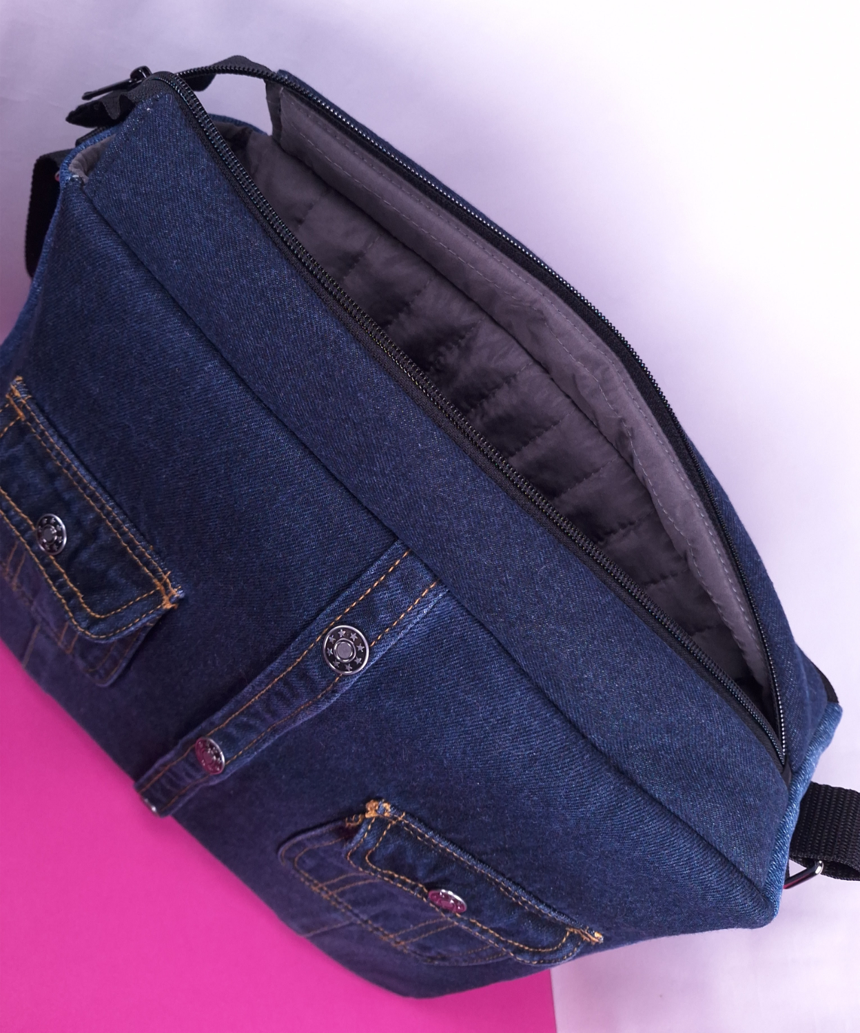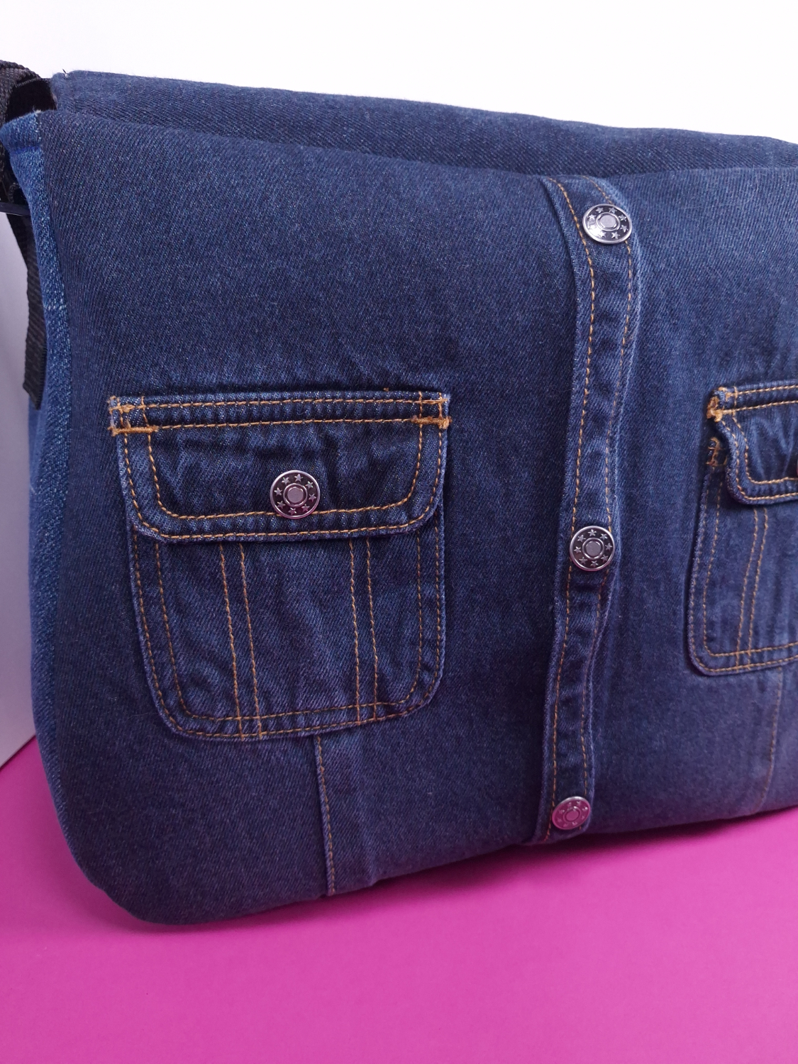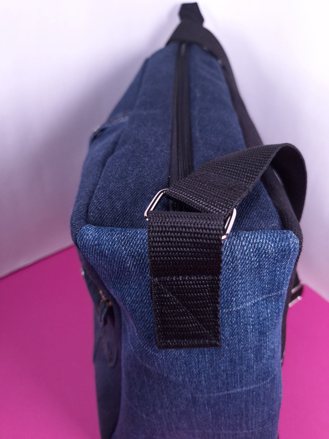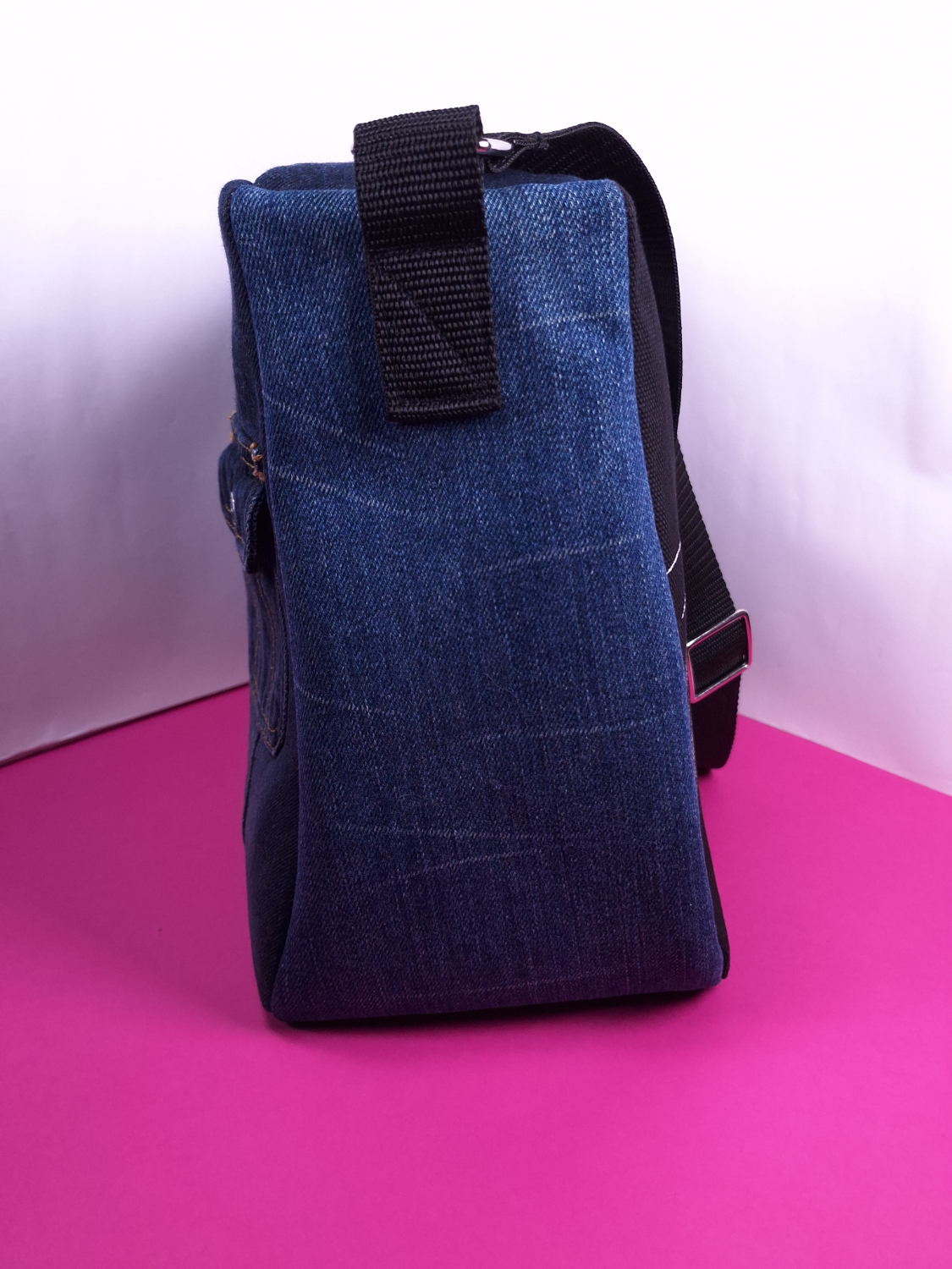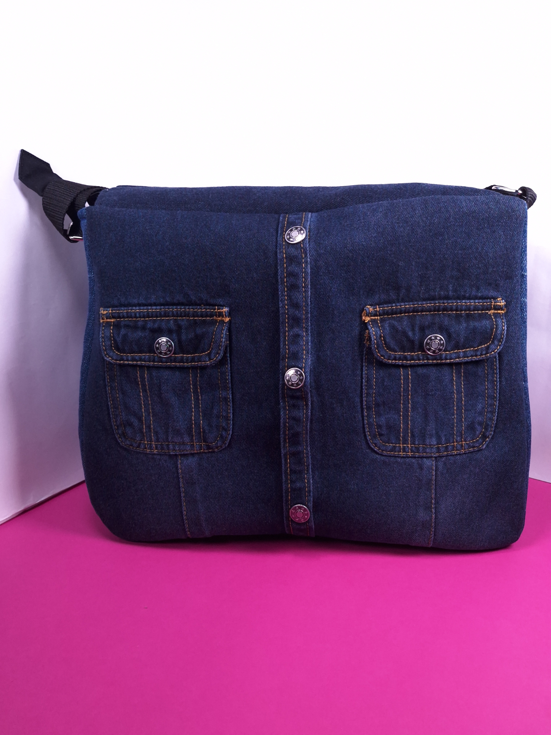 Tämä ryhdikäs uniikki laukku on valmistettu vahvasta sinisestä kierrätysfarkusta ja vuorattu paksulla kierrätyskankaalla(entinen päiväpeite), lisätukea ja ryhtiä tuo paksu tukikangas. Taustakangas on kierrätetystä farkkupaidasta, napitus on ommeltu kiinni, mutta taskujen napit aukeavat.