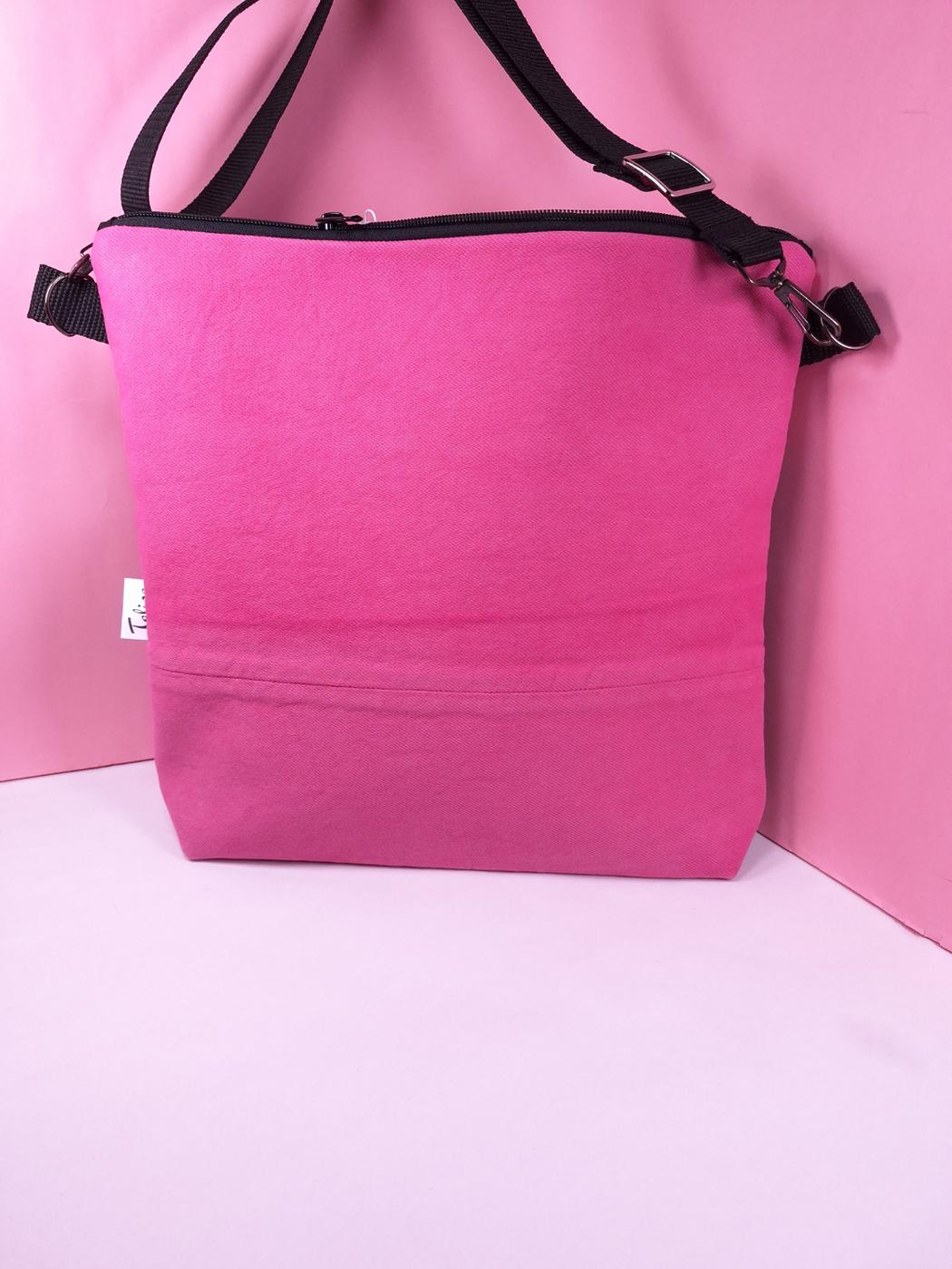 Valmistettu vahvasta vaaleanpunaiseksi värjätystä kierrätysfarkusta ja vuorattu pinkillä puuvillalla, lisätukea ja ryhtiä tuo paksu tukikangas.