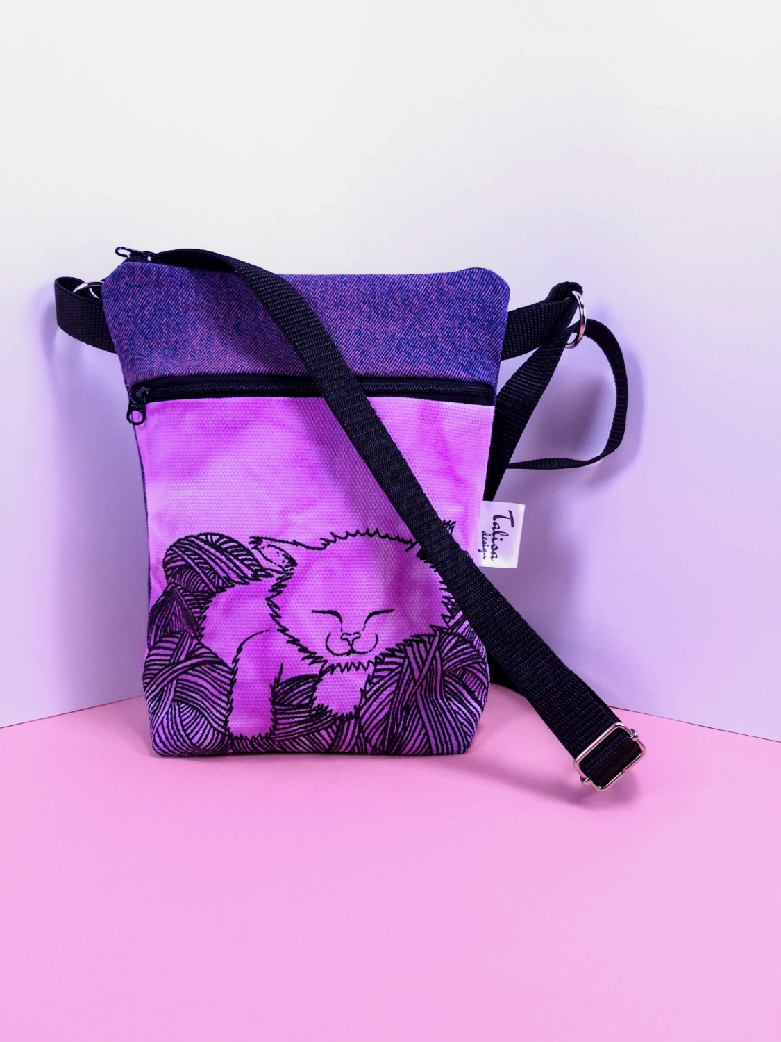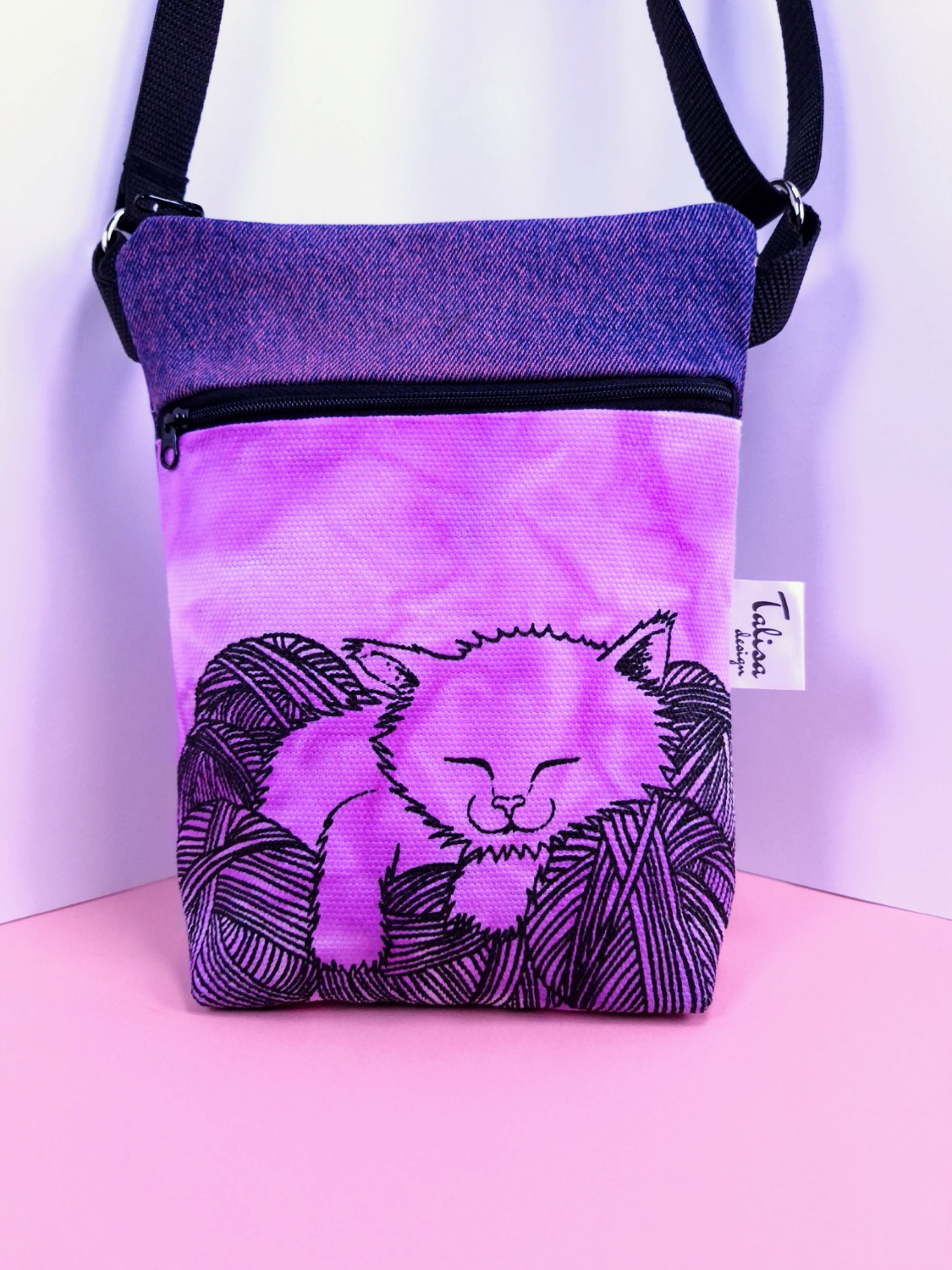 Käsityö-aiheinen kissalaukku kierrätyskankaista