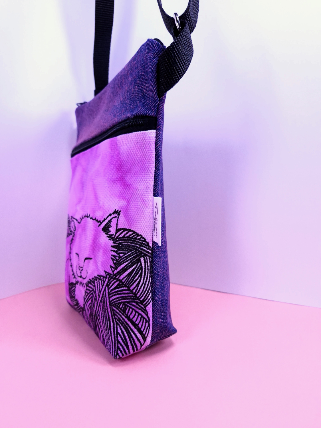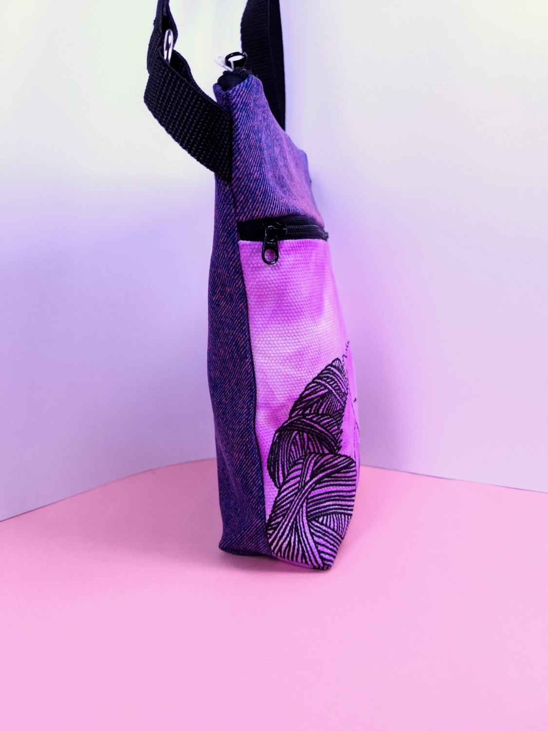 Etupuolella pienen taskun puuvillakangas on värjätty aurinkotekniikalla pinkiksi, taskuun on painettu Kerällä-kuosia kankaanpainotekniikalla, muuten laukku on violetiksi värjättyä kierrätysfarkkua.