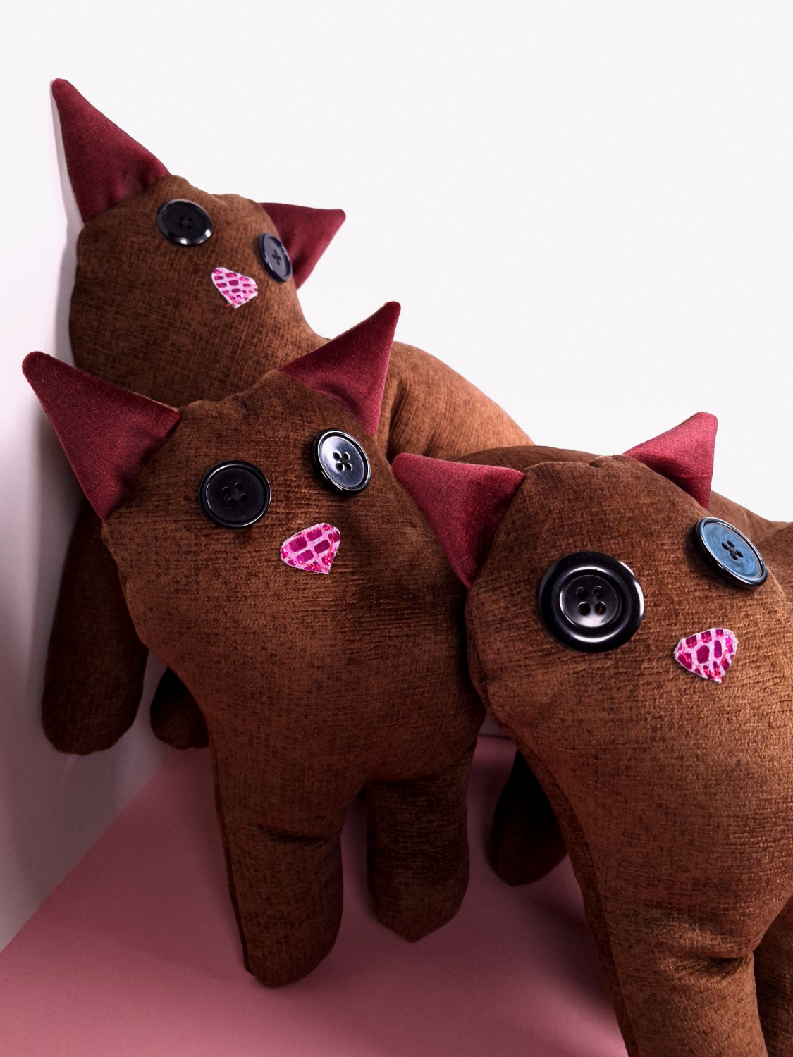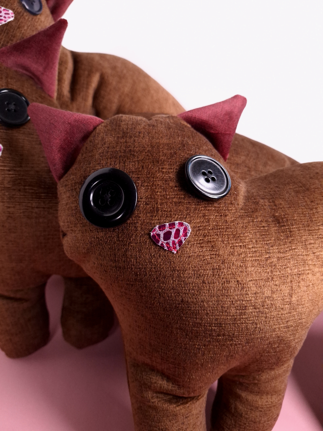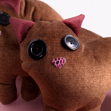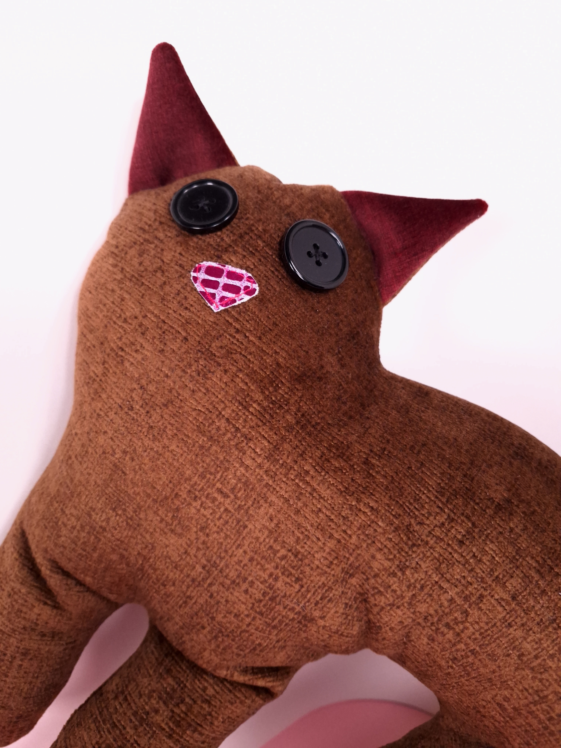 Valmistettu verhoomon ylijäämäkankaasta, silminä isot mustat napit, nenä kimaltavaa nahkaa ja käsinommeltu alareuna umpeen.