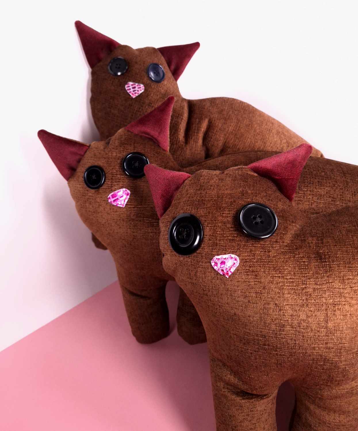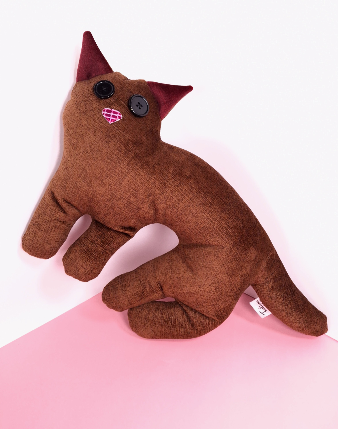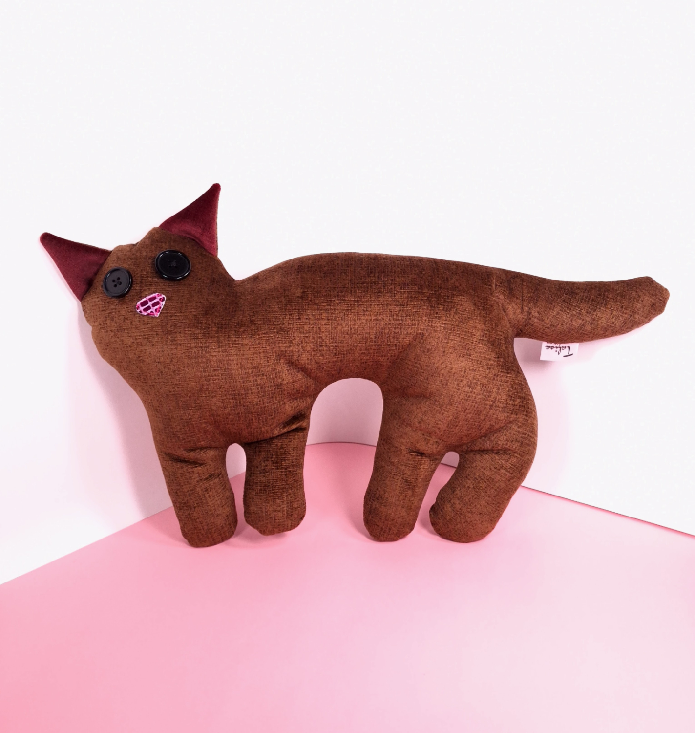 Valmistettu verhoomon ylijäämäkankaasta, silminä isot mustat napit, nenä kimaltavaa nahkaa ja käsinommeltu alareuna umpeen.