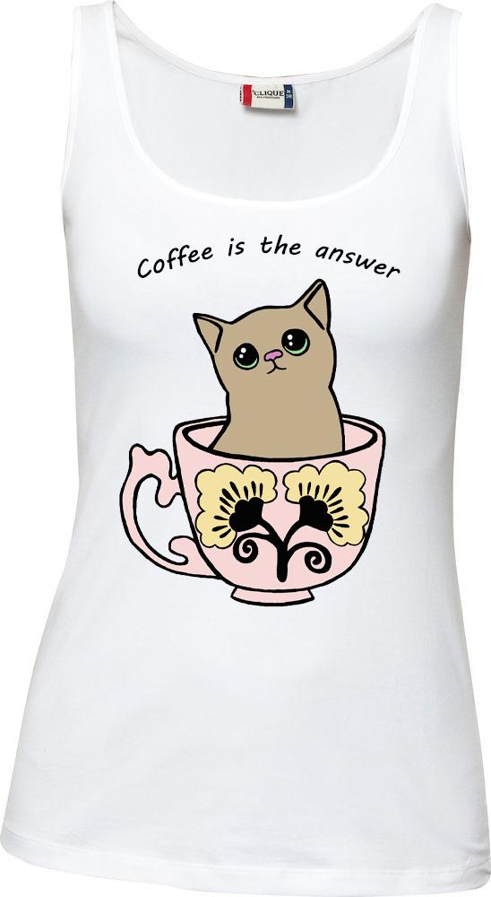 Huom! Kahvi-aiheinen teksti! Kurkista toinen kuppikissa-toppi, jossa on tee-aiheinen teksti. Tilaus aikaa on 26.3.2026 asti, jonka jälkeen teen paitatilauksen paikalliseen painotaloon. Paidat lähetetään tilaajille heti, kun ovat painosta saapuneet. Koot: S, M, L, XL, XXL