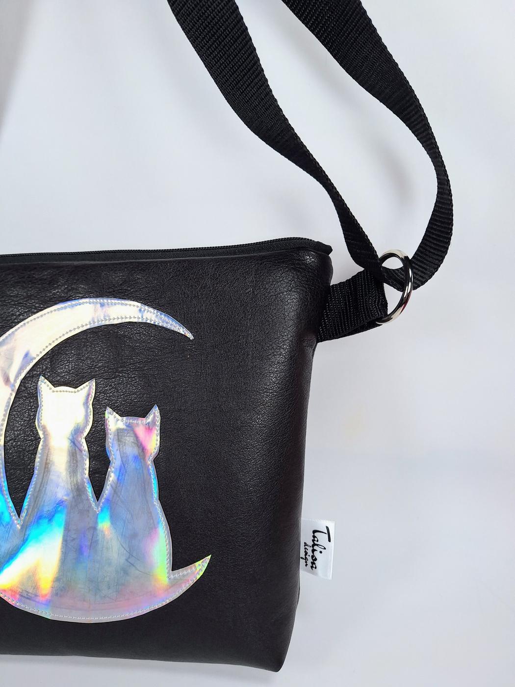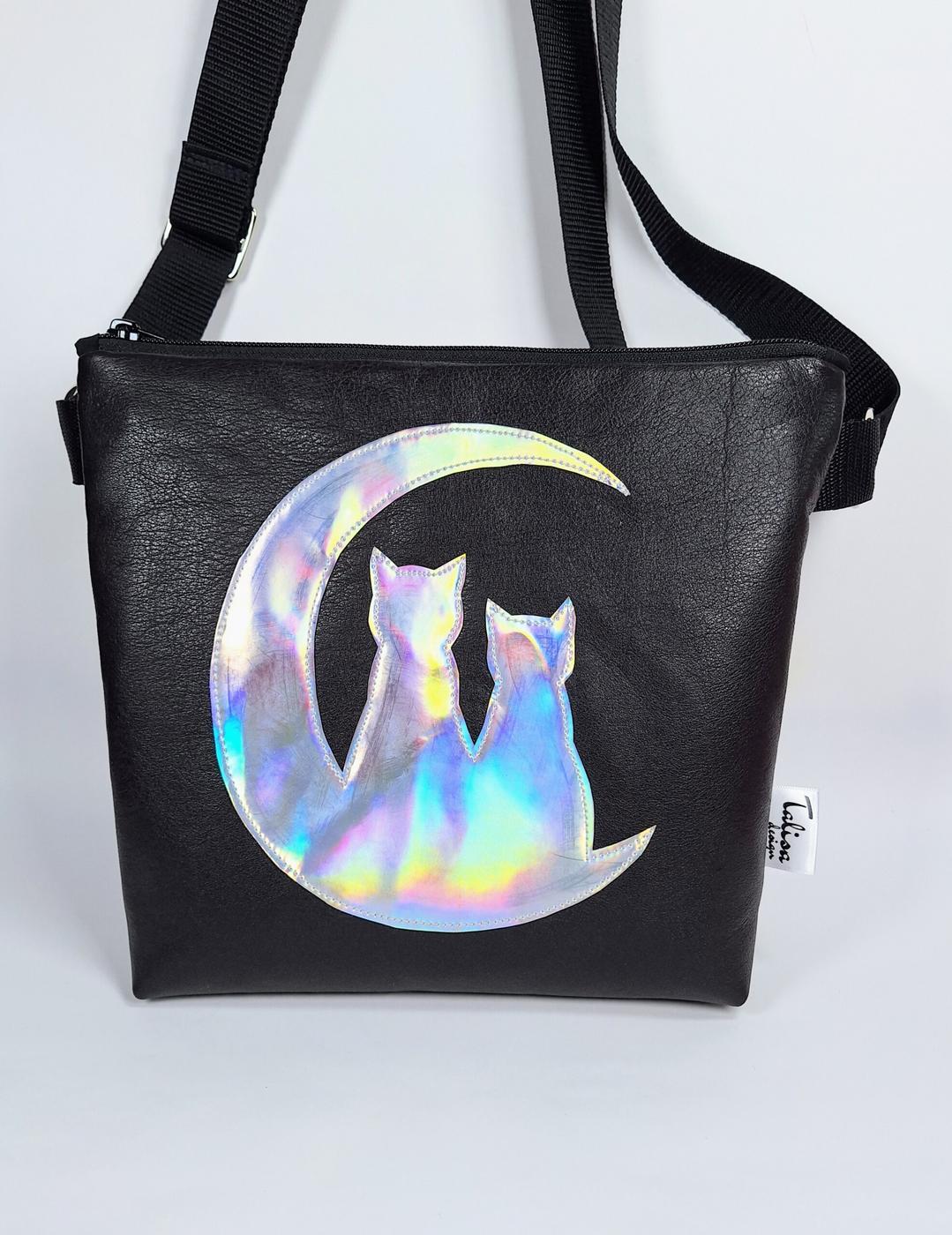 • Kimaltavasta hologrammikankaasta leikattu Kuutamo on tikattu laukun etupuolelle