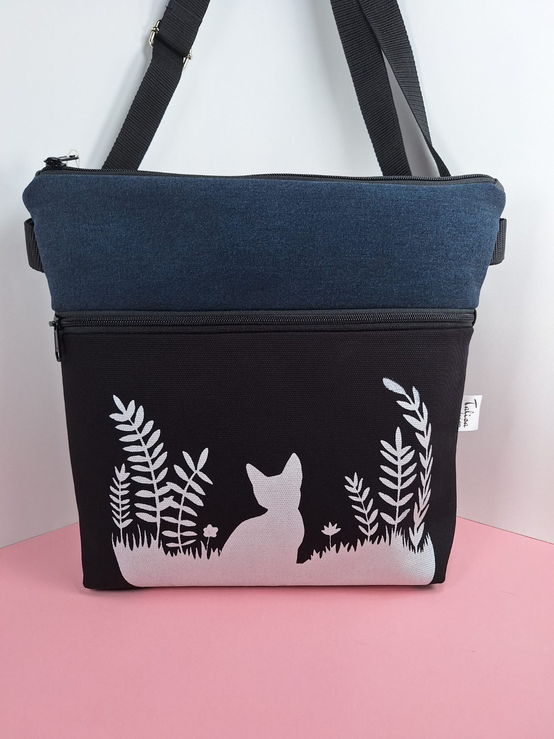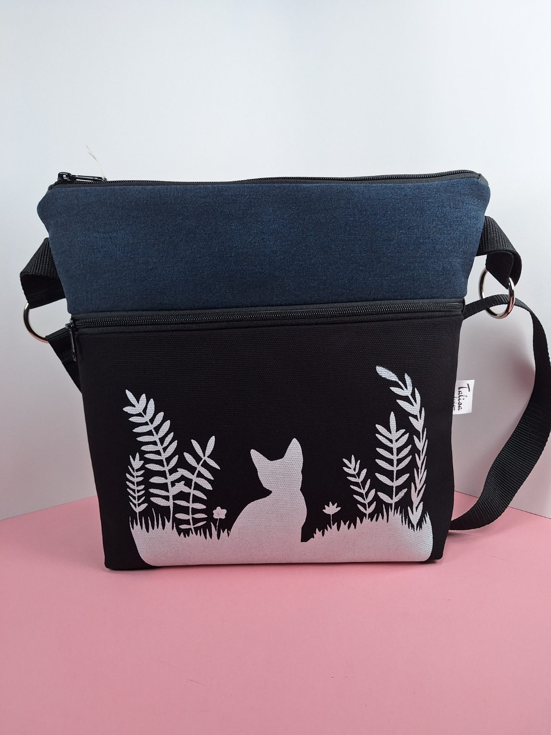 Laukun sivutaskuun on käsin painettu kuvio kankaanpainoväreillä, mikä tekee jokaisesta laukusta ainutlaatuisen.