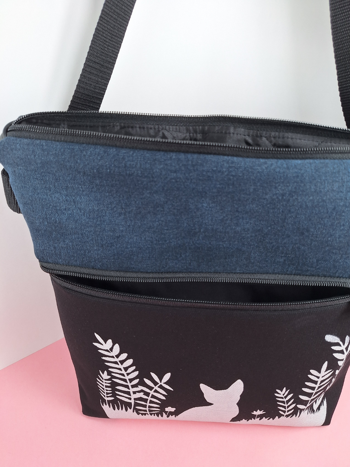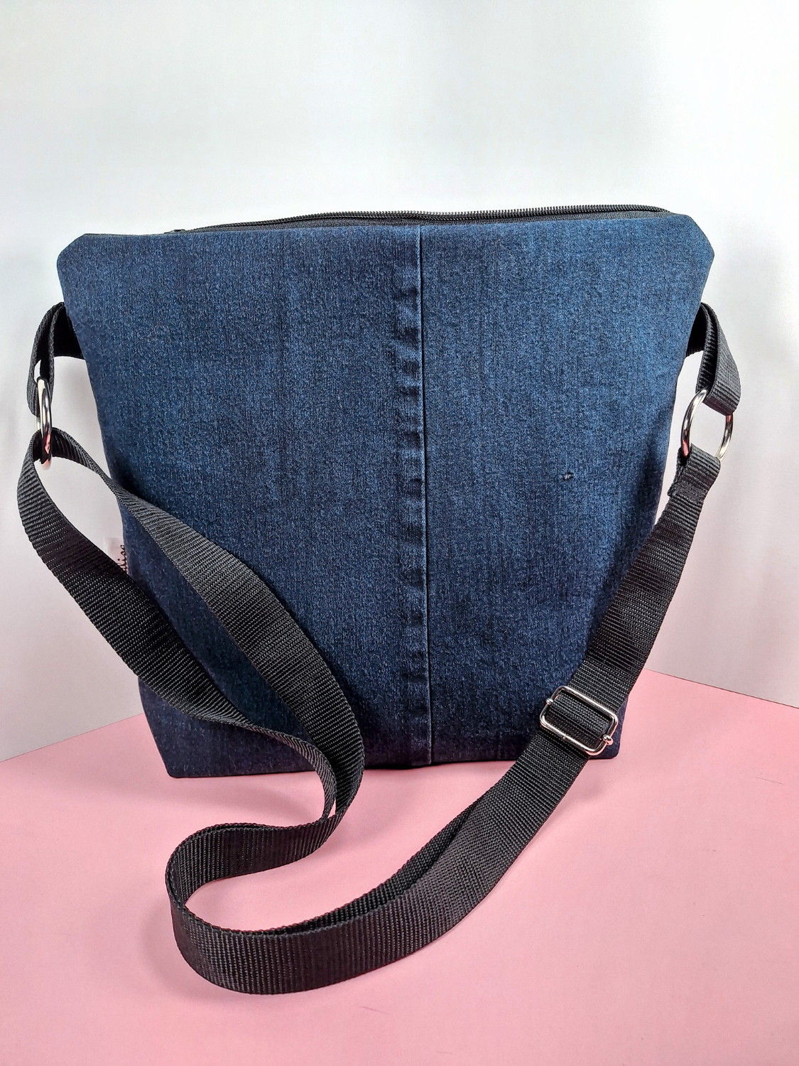 Valmistettu vahvasta tumman sinisestä kierrätysfarkusta ja vuorattu pehmeällä tikkivanukankaalla ja sivutasku mustalla puuvillalla, lisätukea ja ryhtiä tuo paksu tukikangas.
