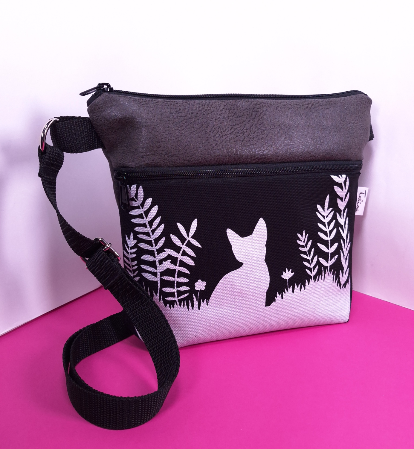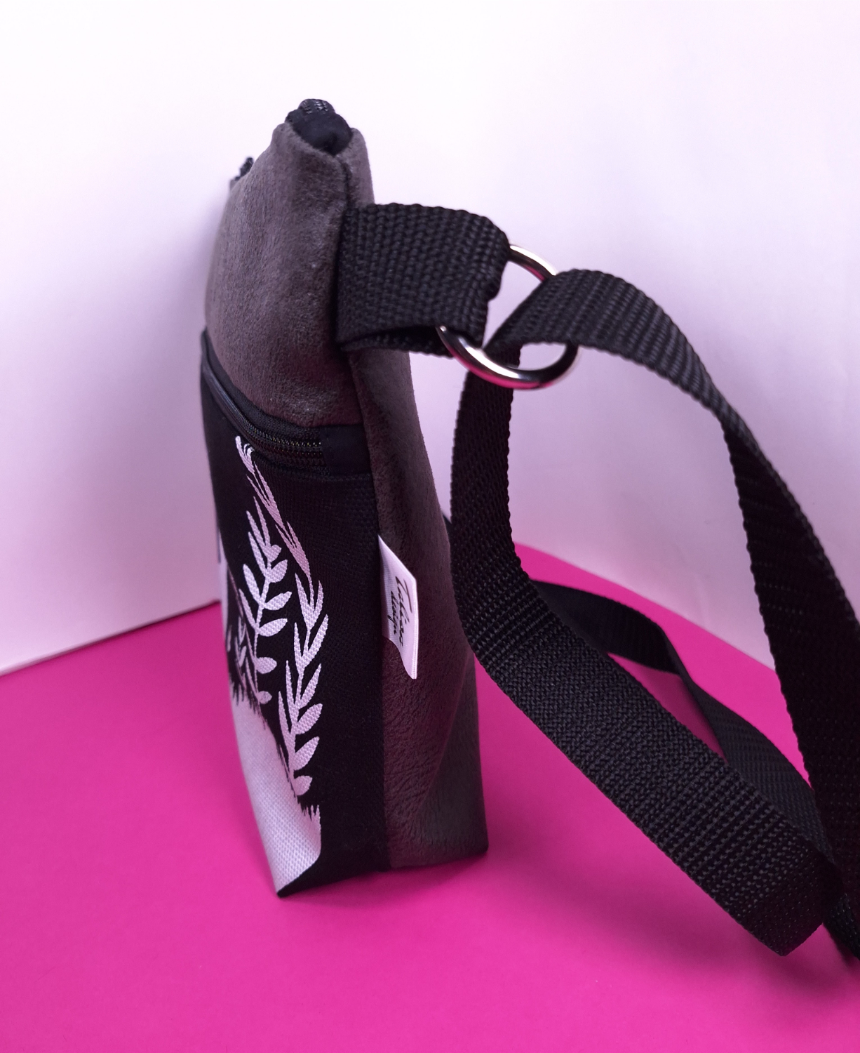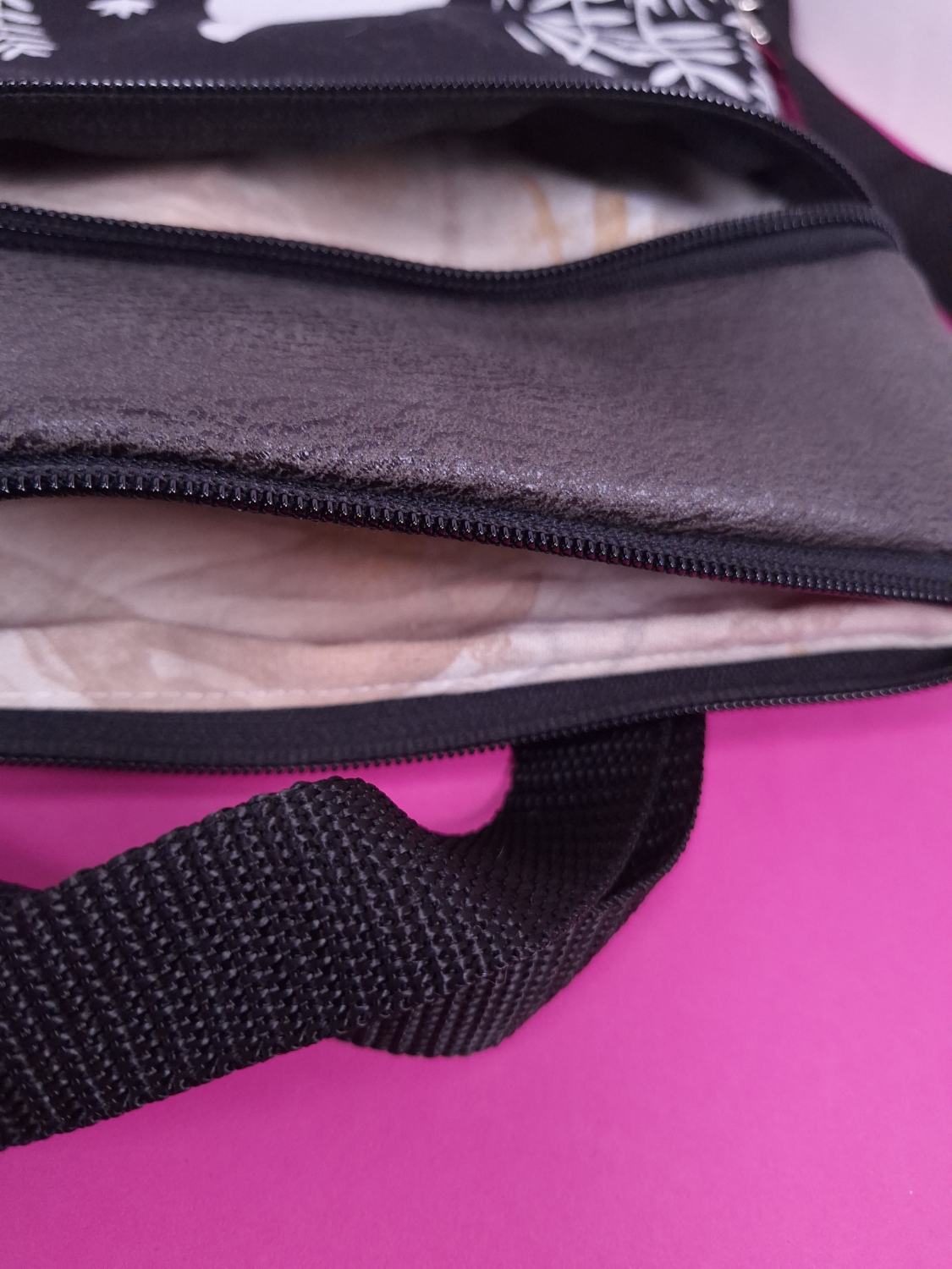 • Sivutasku: Mustaa paksua puuvillaa, johon käsin painettu kuvio kankaanpainoväreillä