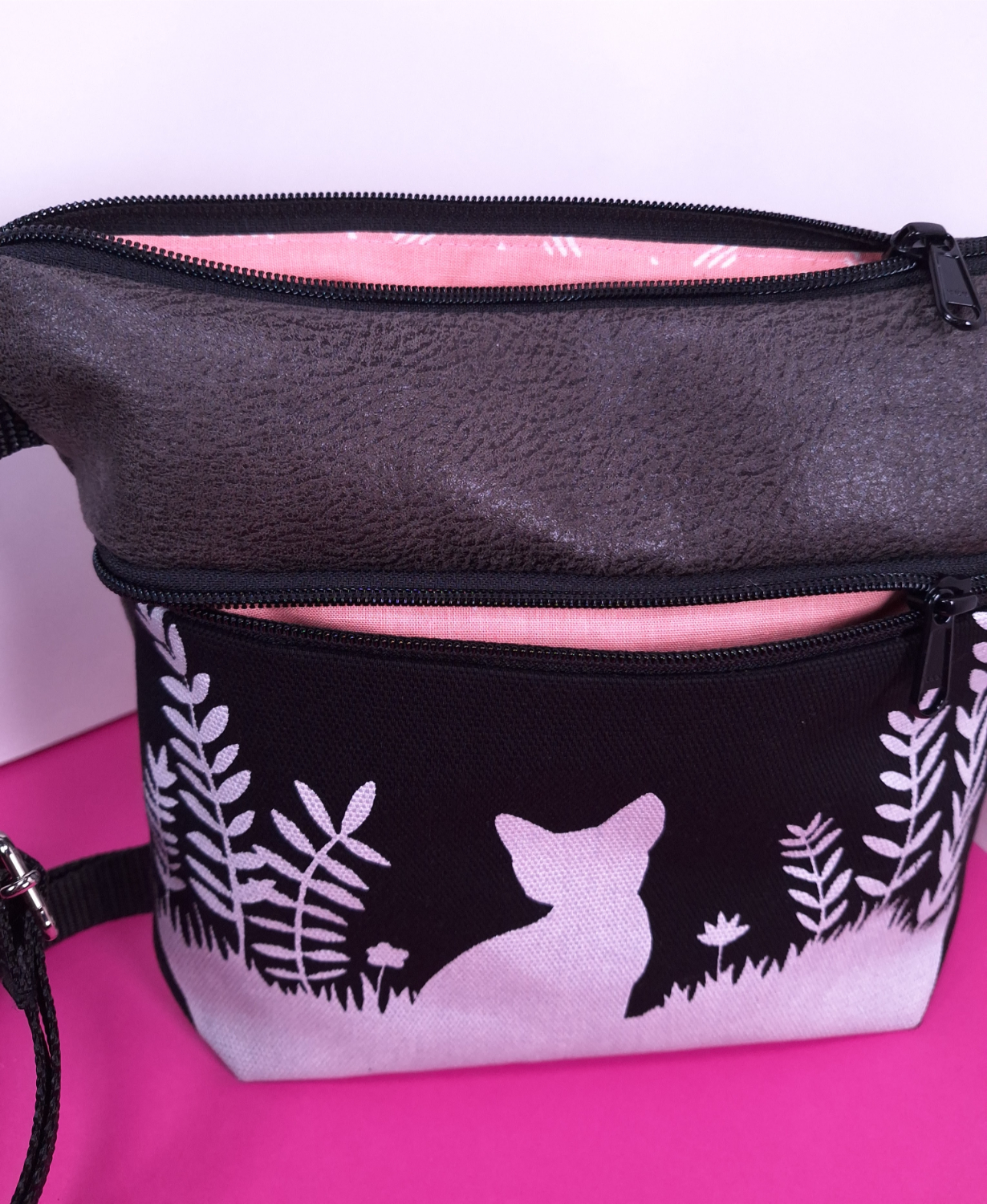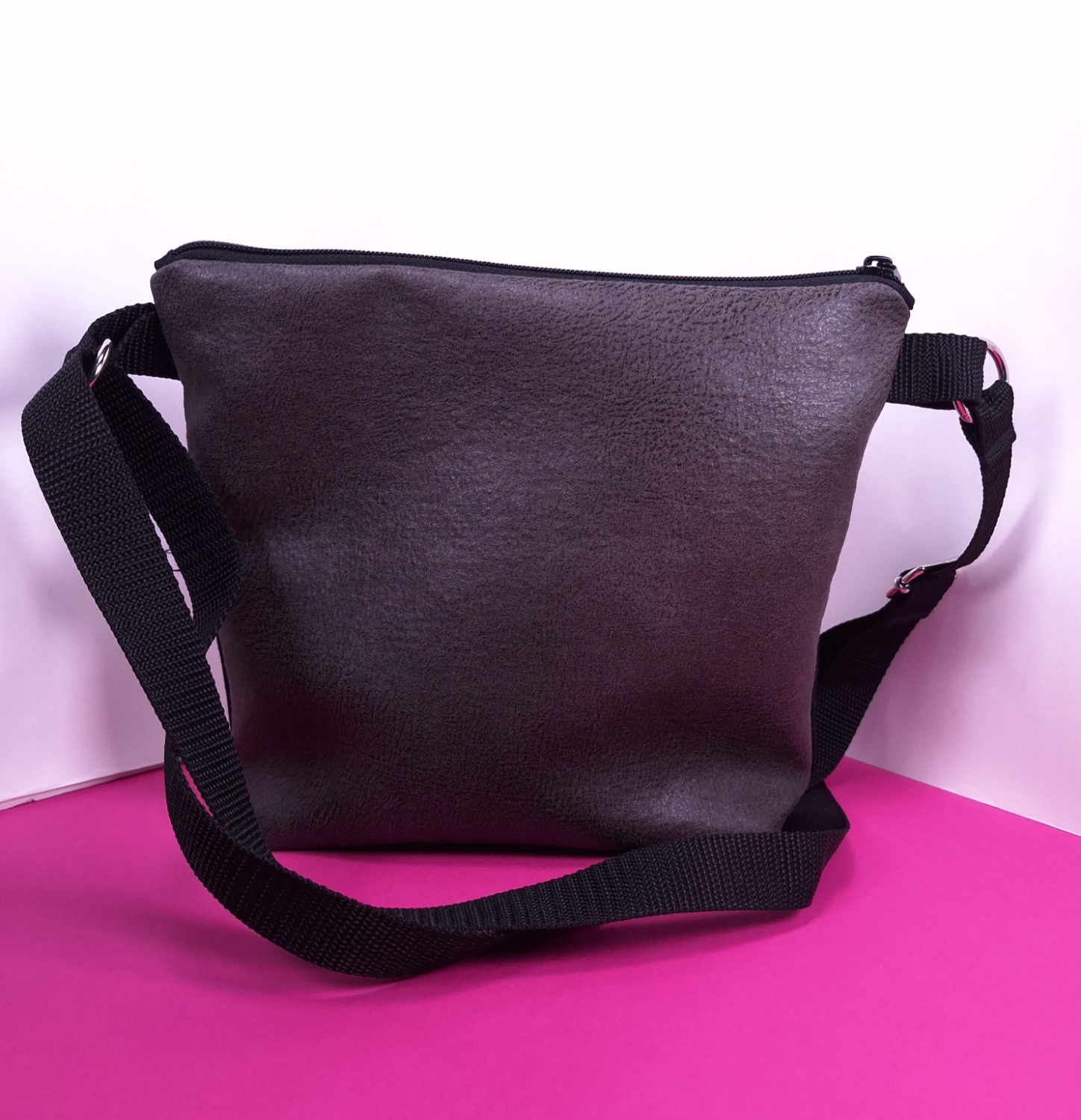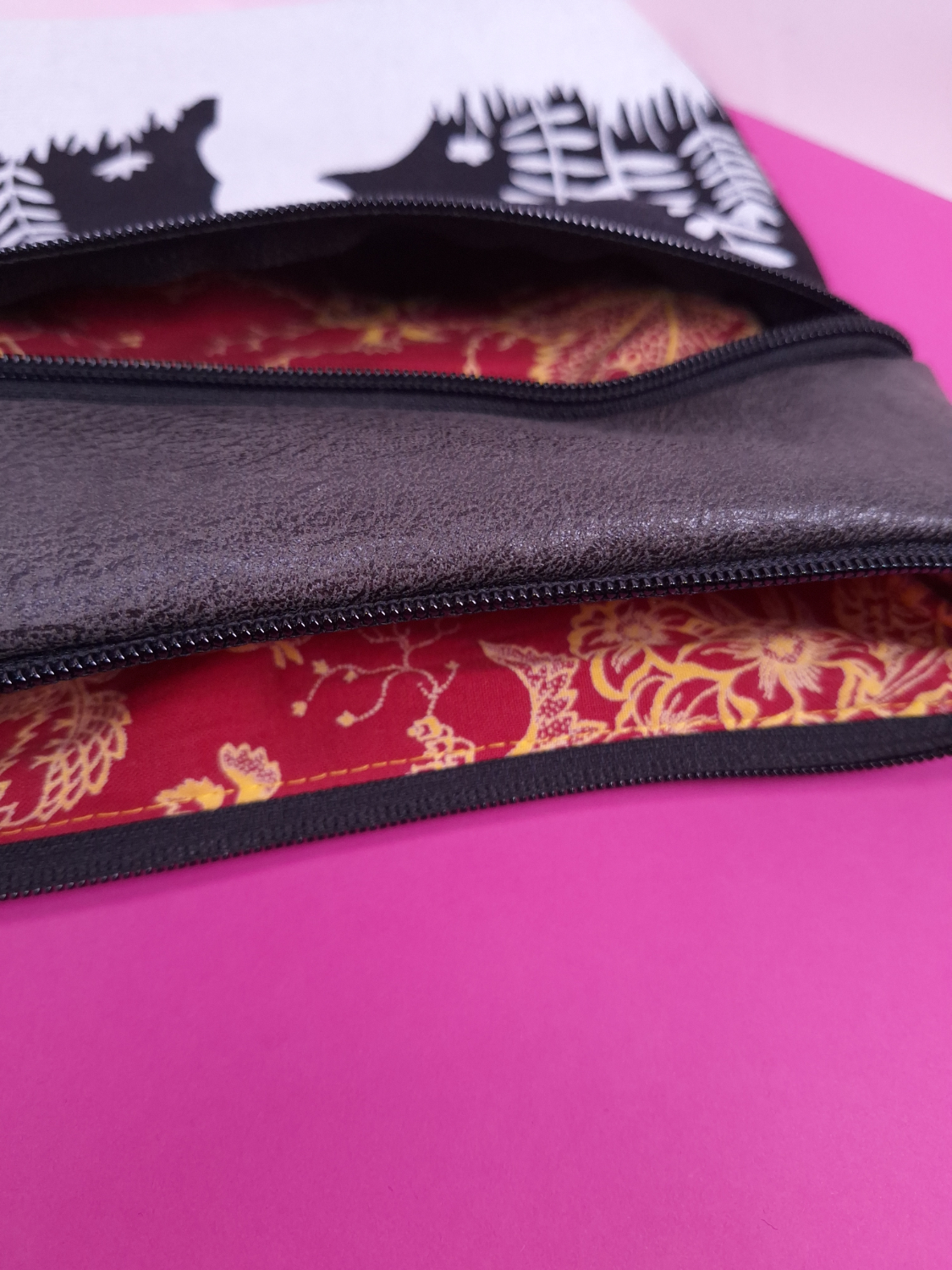 • Sivutasku: Mustaa paksua puuvillaa, johon käsin painettu kuvio kankaanpainoväreillä