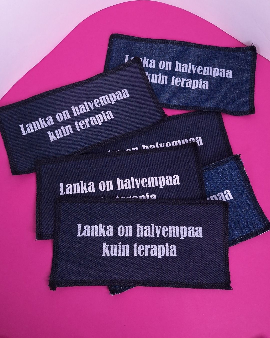 Kierrätysfarkkua jää tuotteiden valmistuksessa usein paljon silppua ja nämä isommat palat päätyivät kangasmerkeiksi.