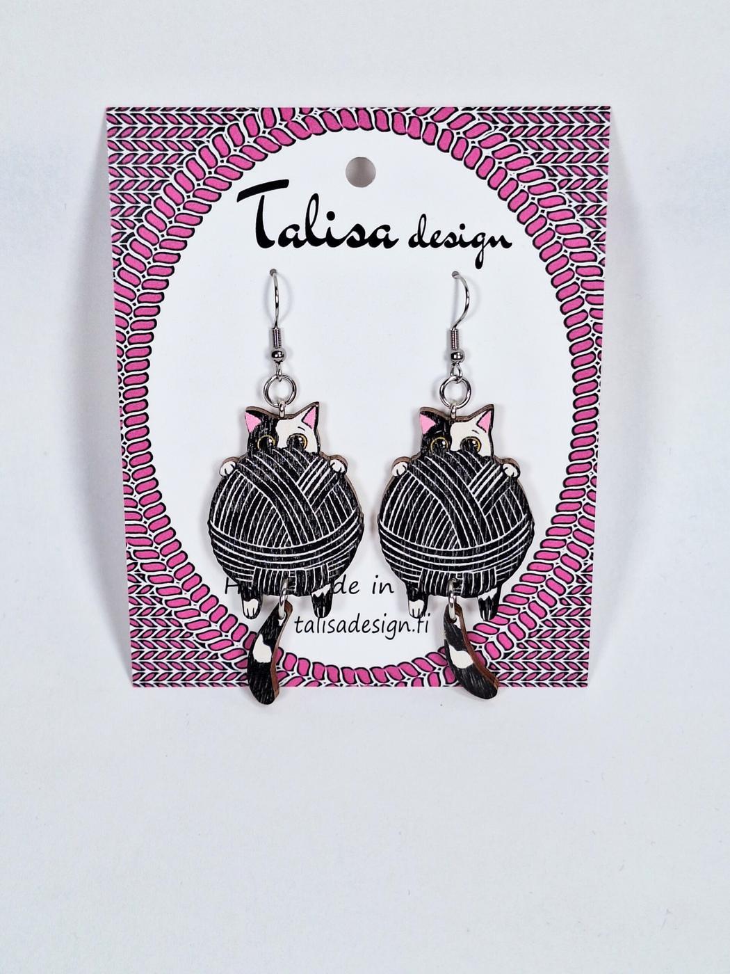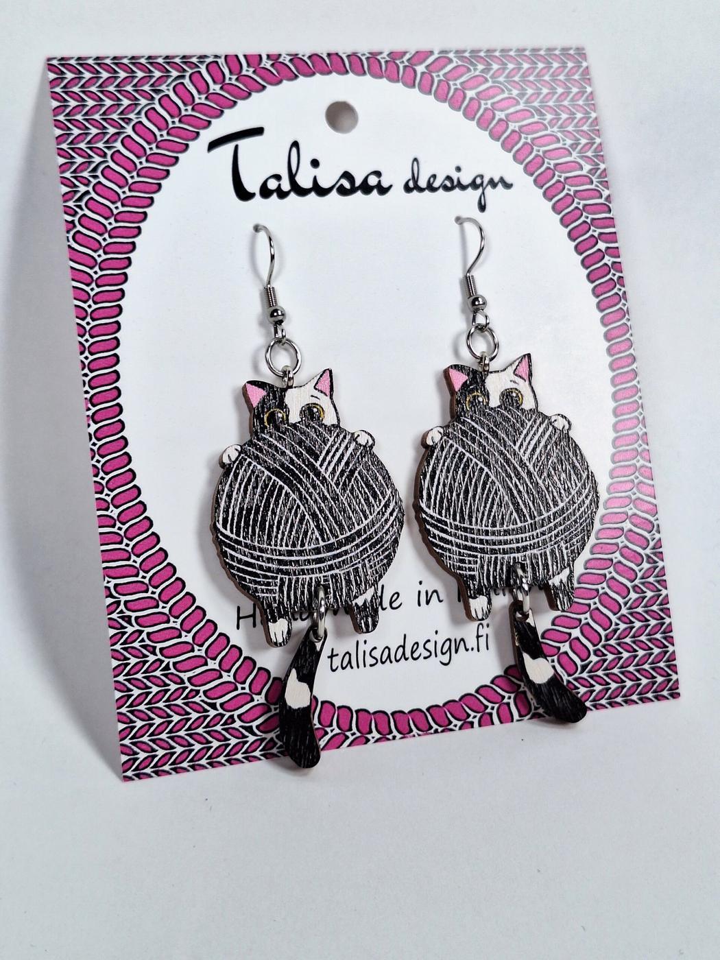 Näissä korvakoruissa kissanhäntä on liitetty mustaan lankakerään pienellä renkaalla, jotta häntä pystyy heilumaan hauskasti menossa mukana!