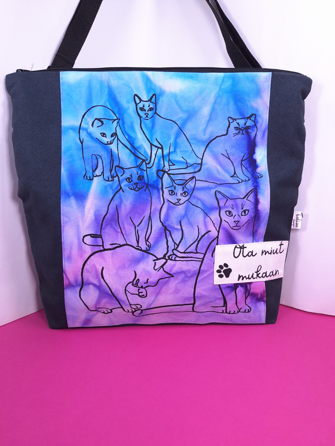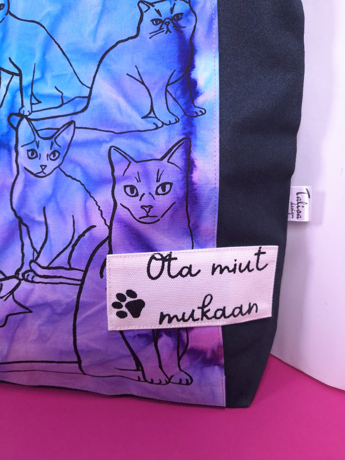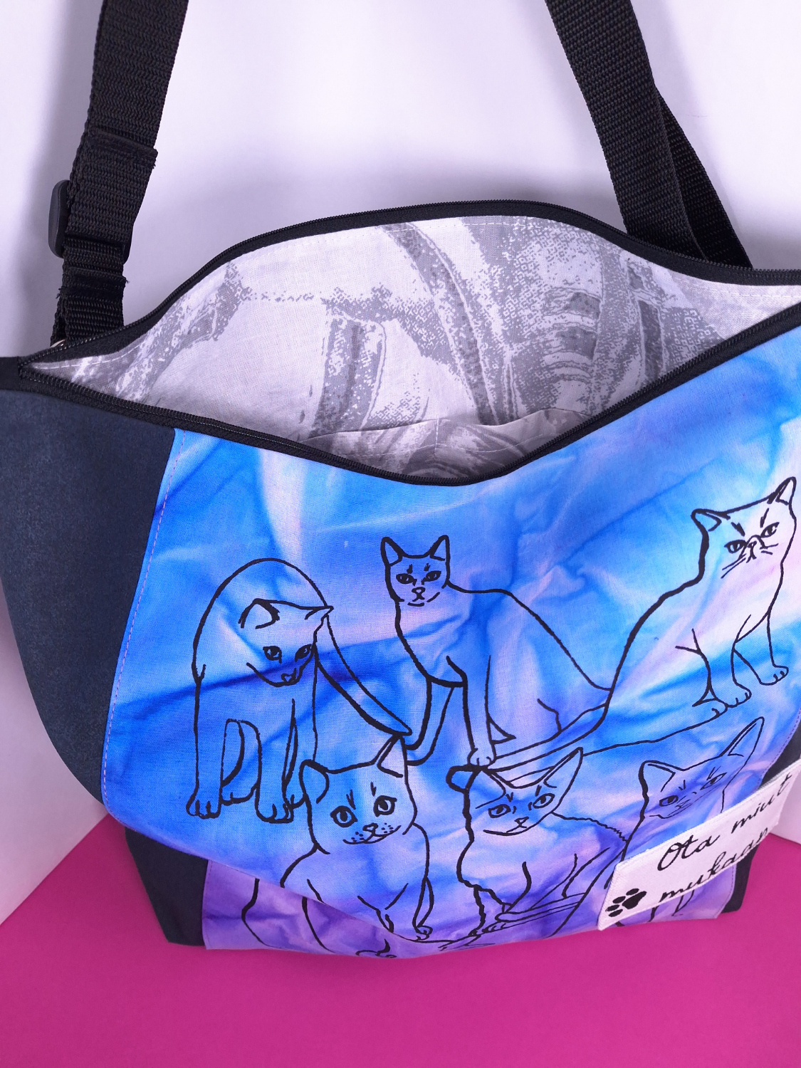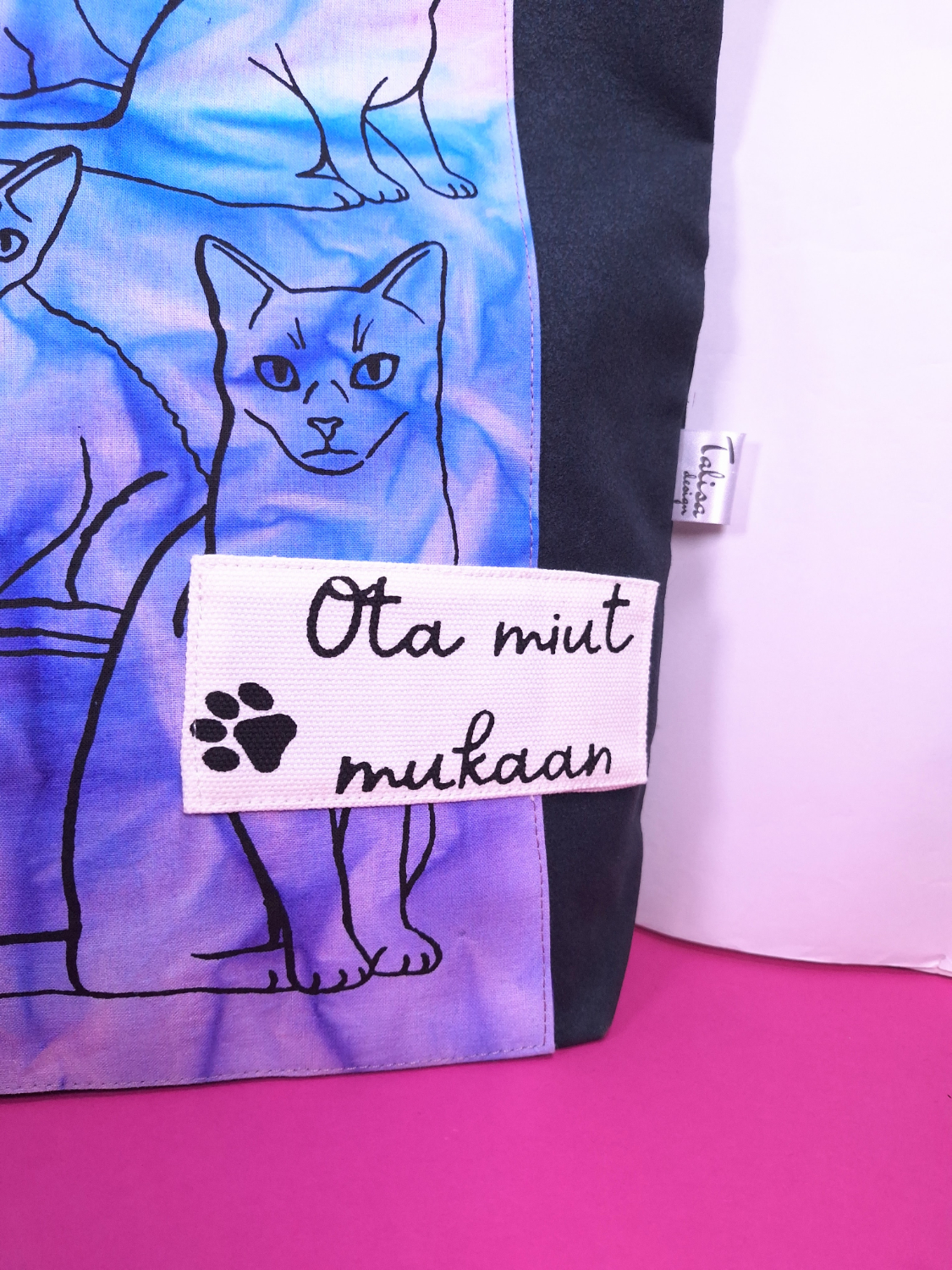 • Materiaali: Tummanharmaata kierrätyskangasta, päälle tikattu aurinkotekniikalla värjättyä puuvillaa, jossa kissakuvio