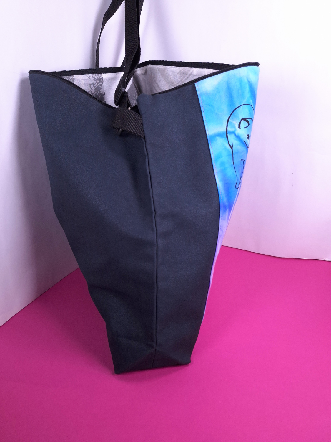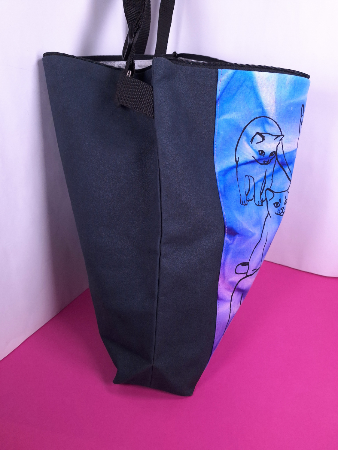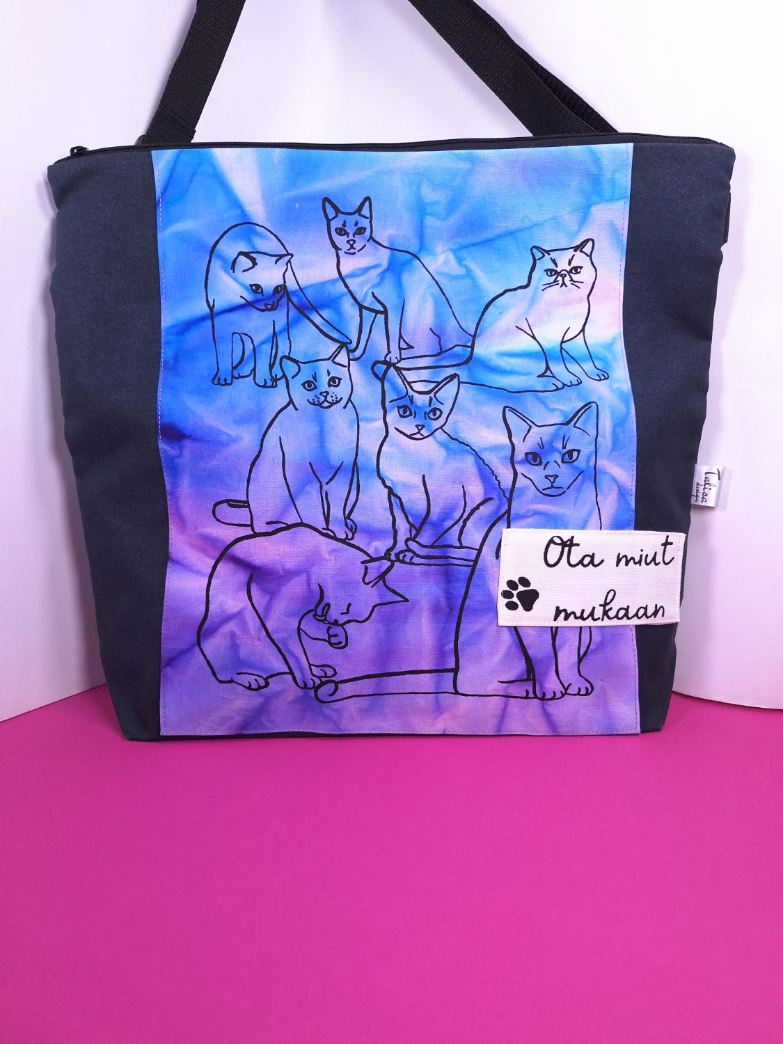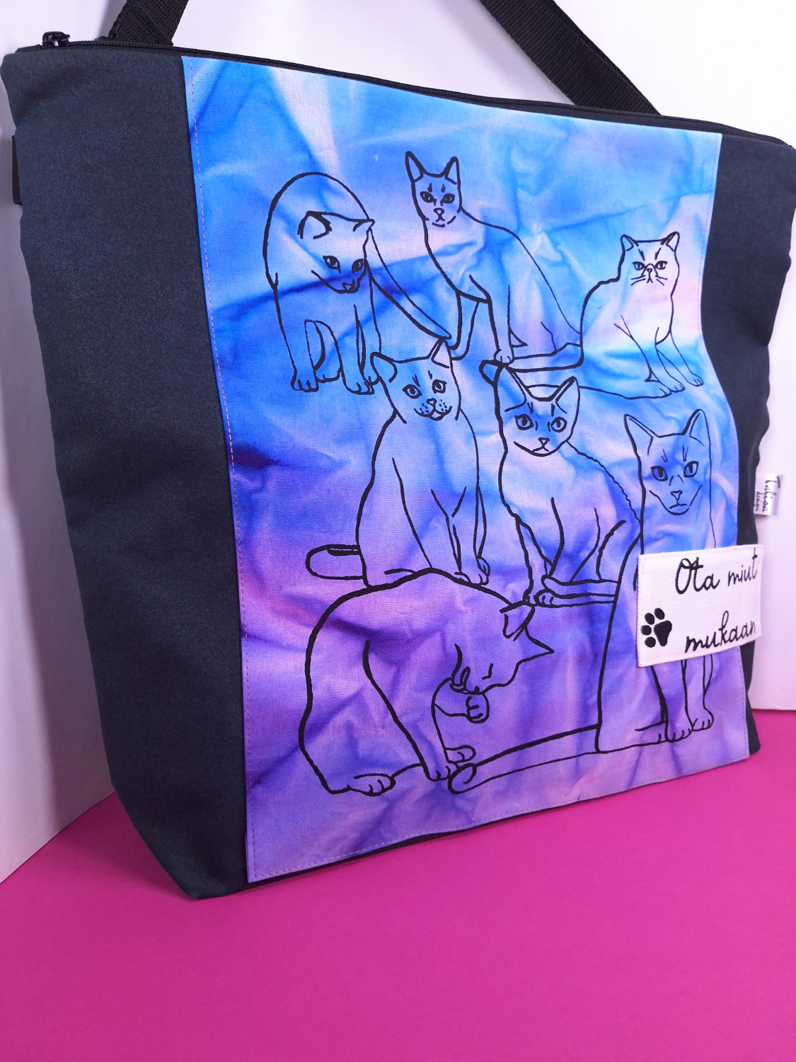 • Materiaali: Tummanharmaata kierrätyskangasta, päälle tikattu aurinkotekniikalla värjättyä puuvillaa, jossa kissakuvio