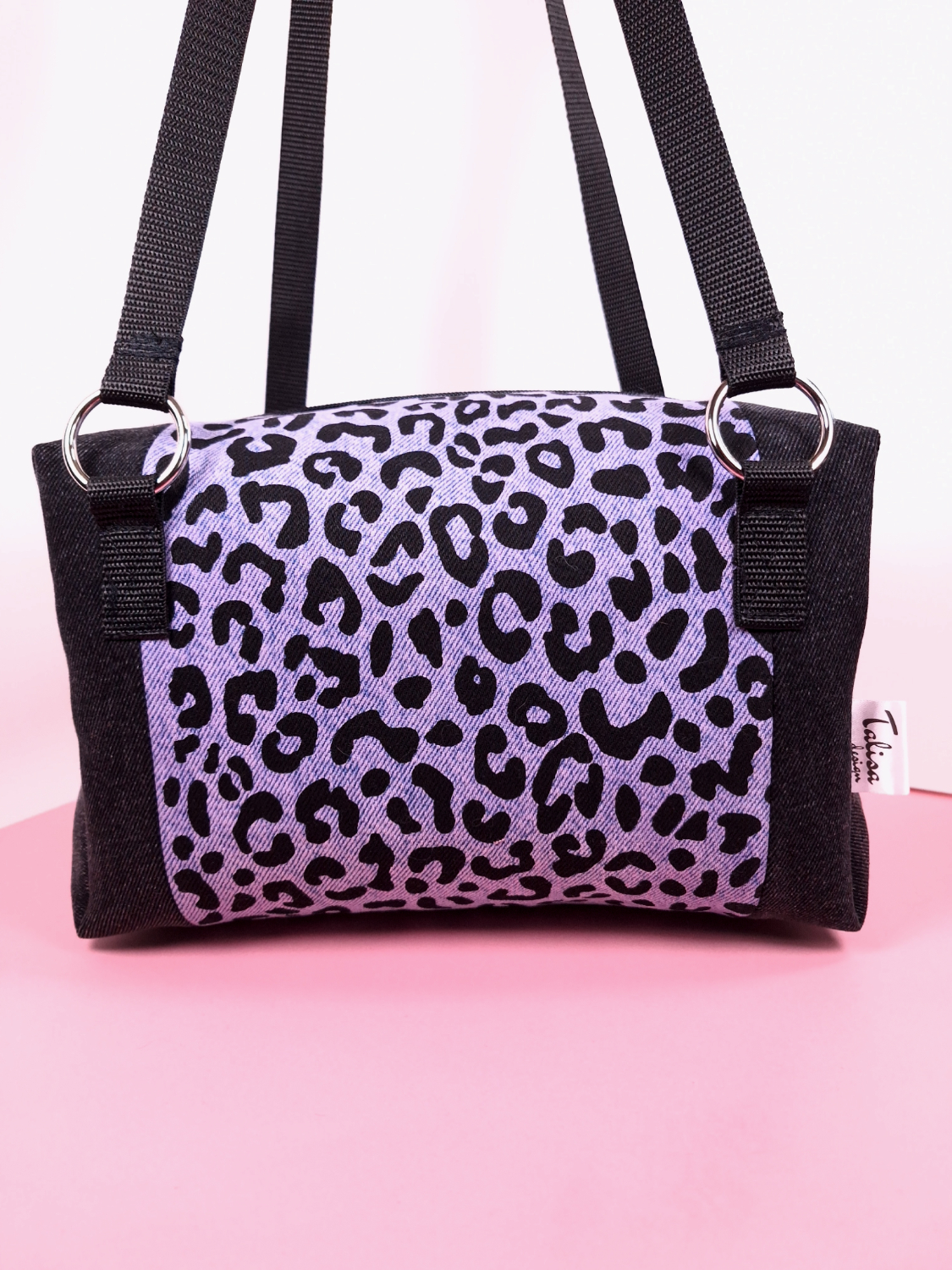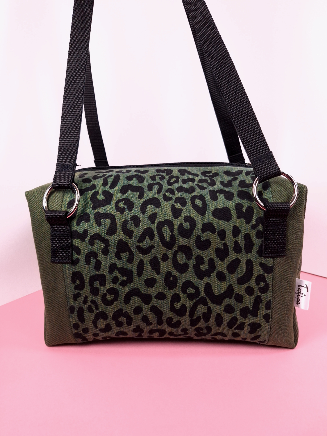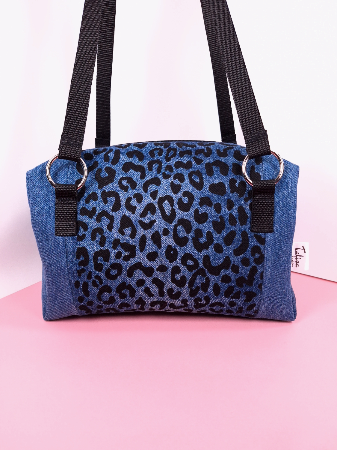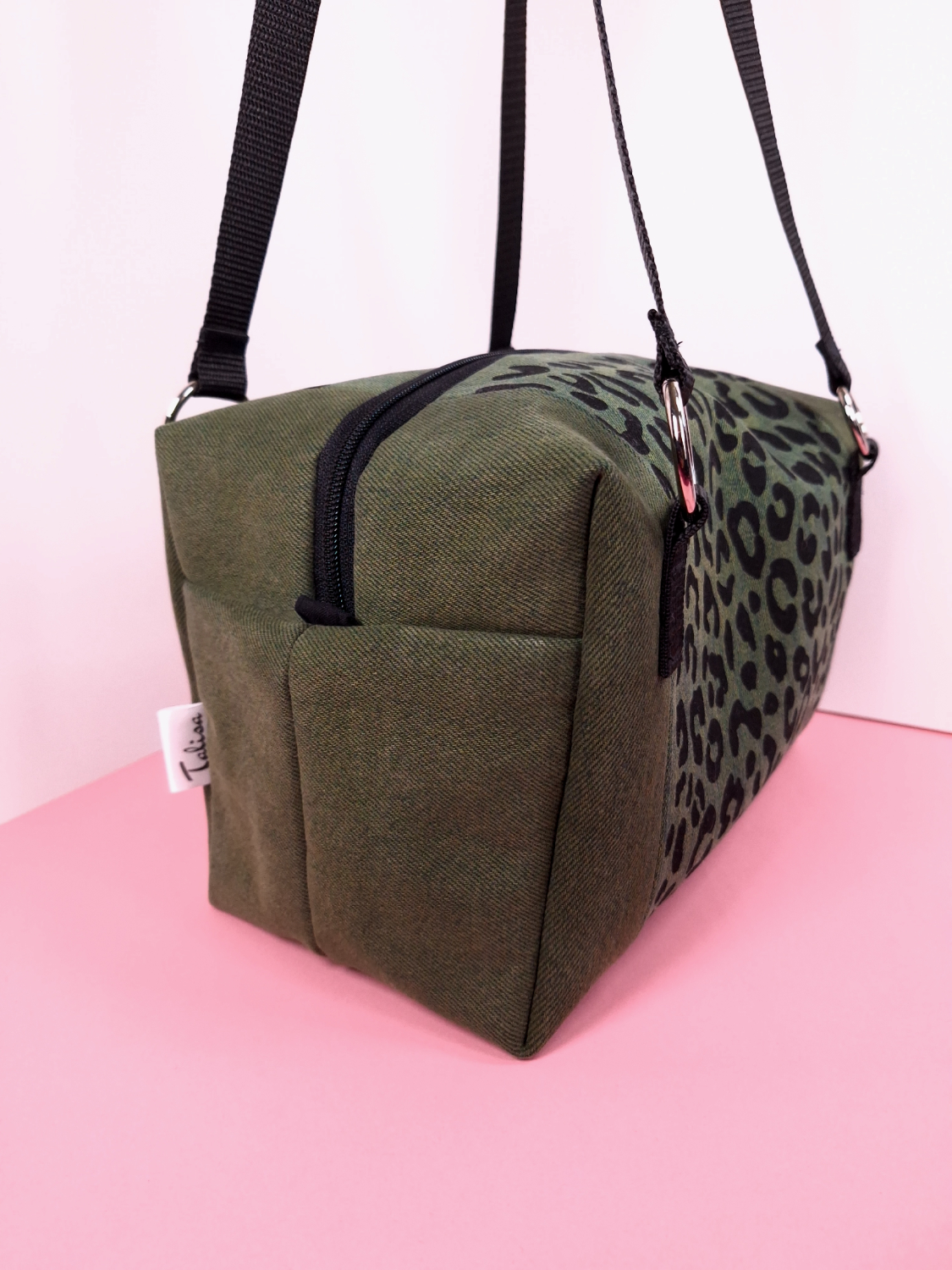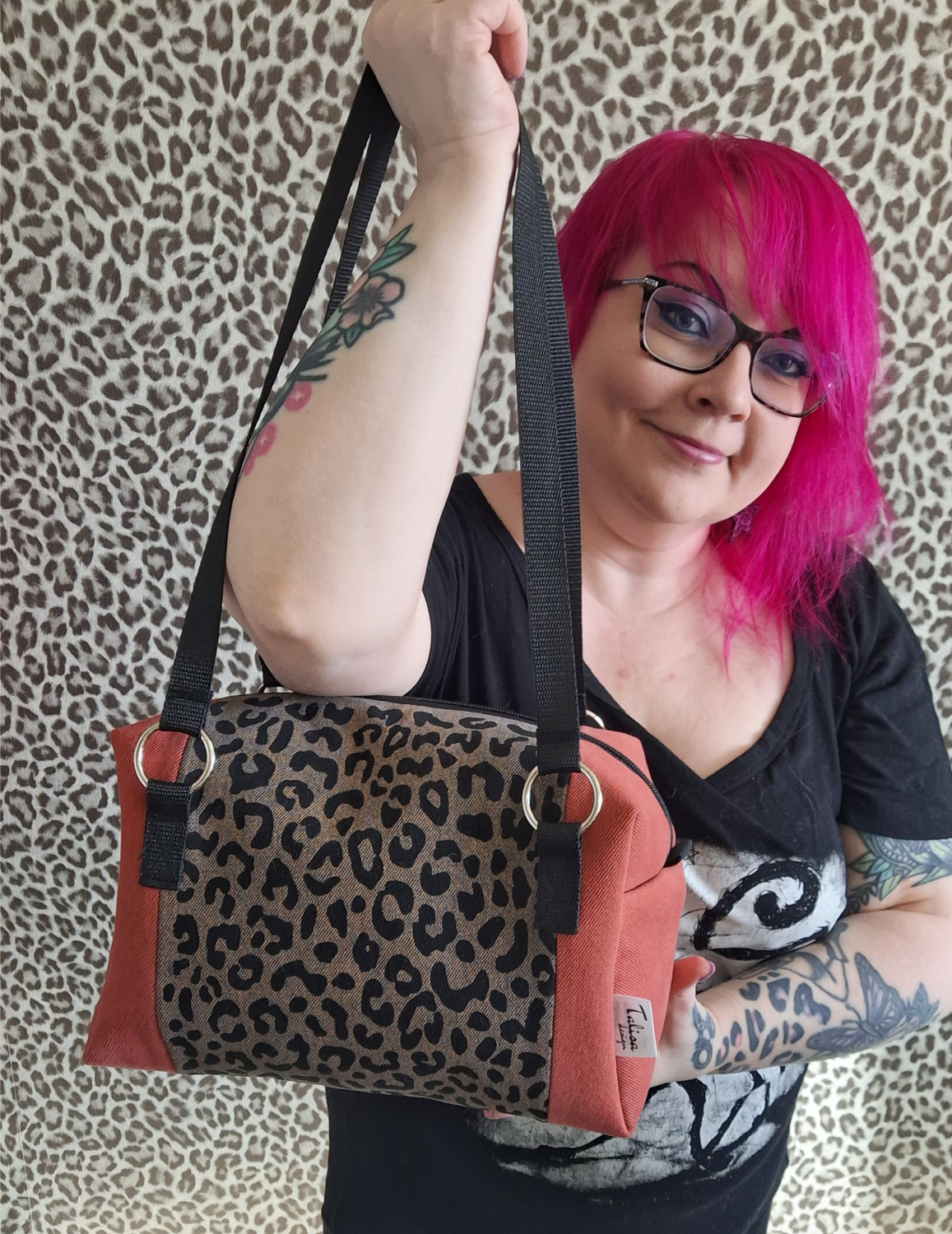 Laukun molemminpuolin on pantterikuosia, joka on painettu käsin kankaanpainoseulalla mustalla kangasvärillä.