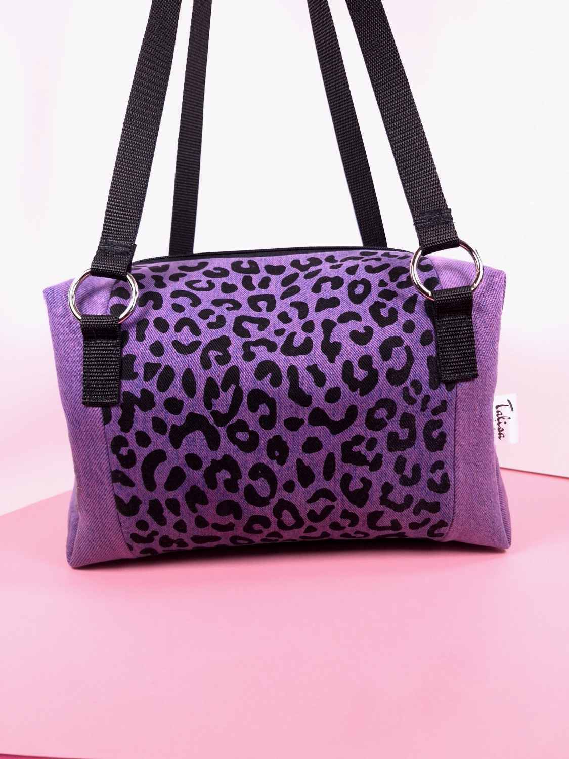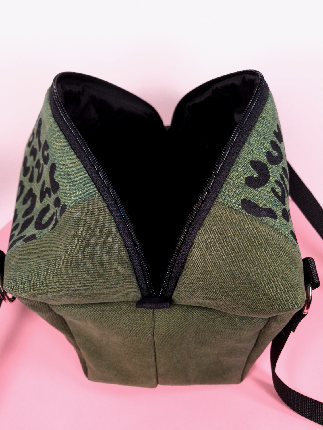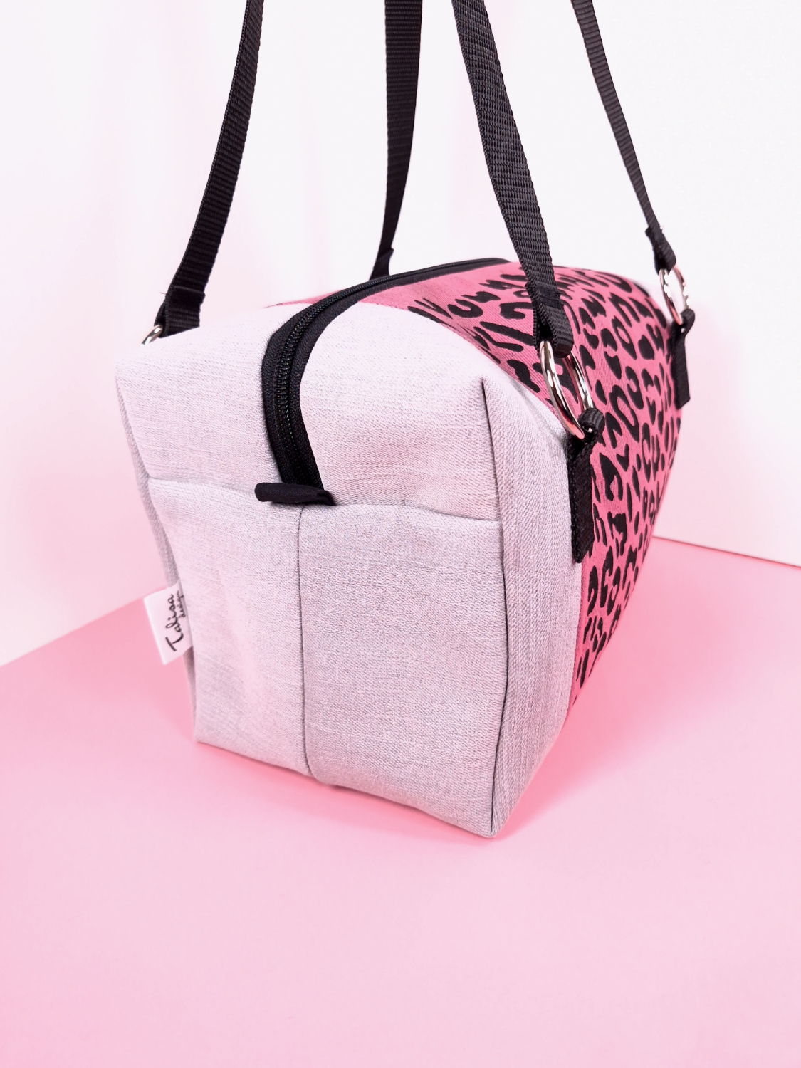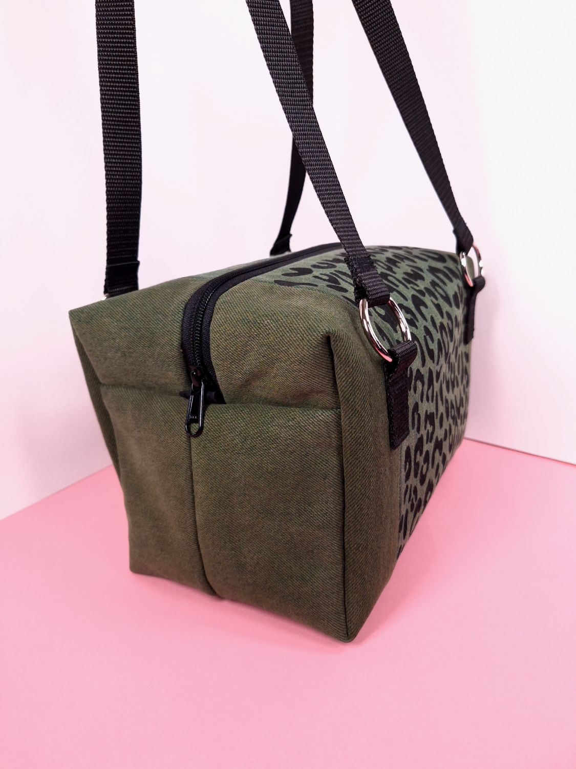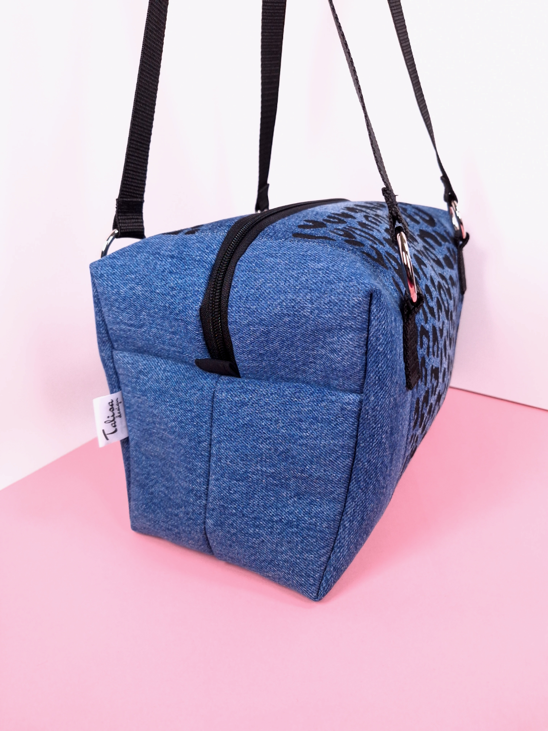 Laukun molemminpuolin on pantterikuosia, joka on painettu käsin kankaanpainoseulalla mustalla kangasvärillä.