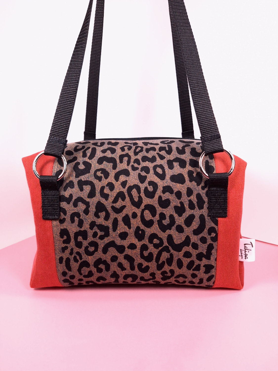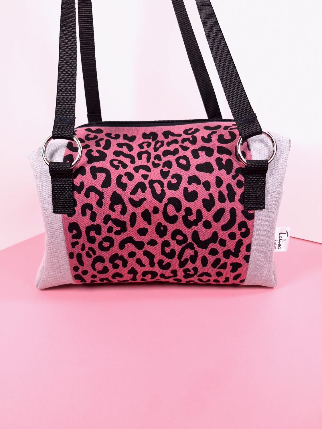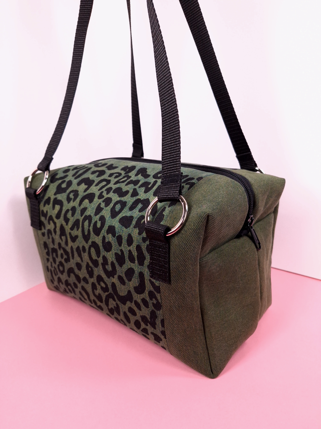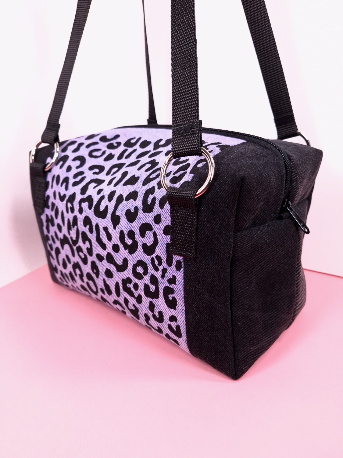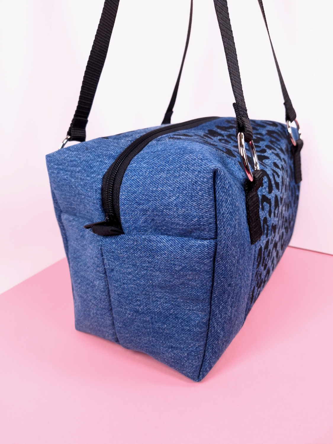 Laukun molemminpuolin on pantterikuosia, joka on painettu käsin kankaanpainoseulalla mustalla kangasvärillä.
