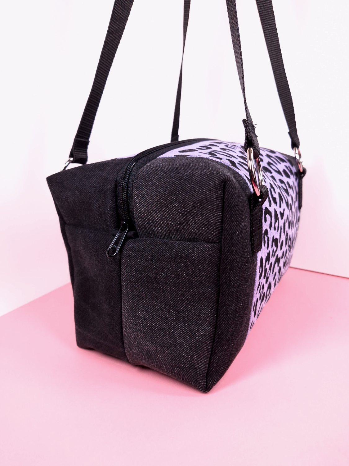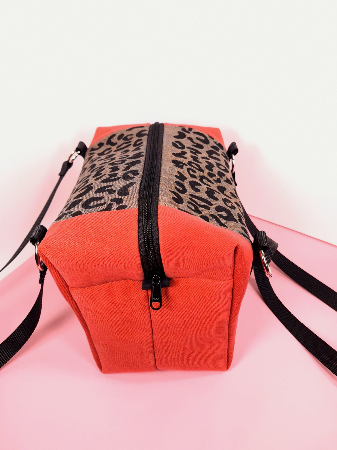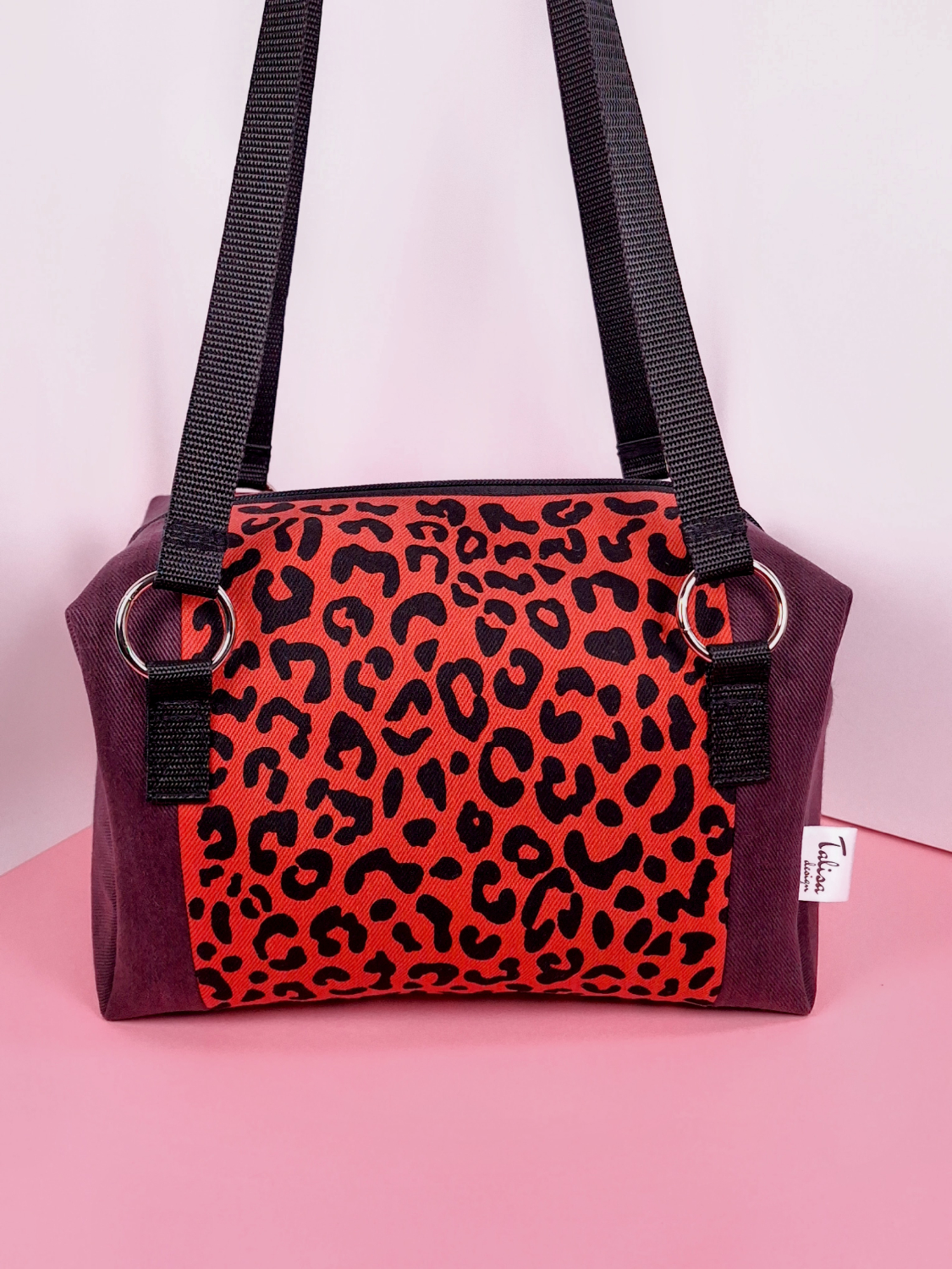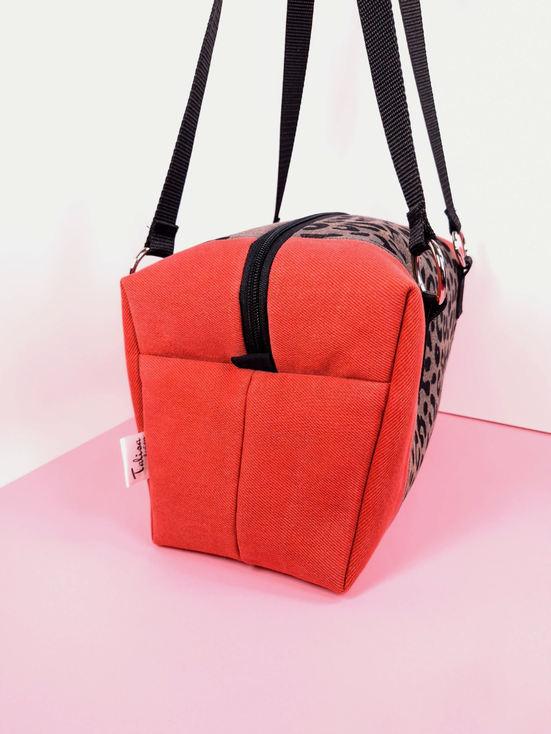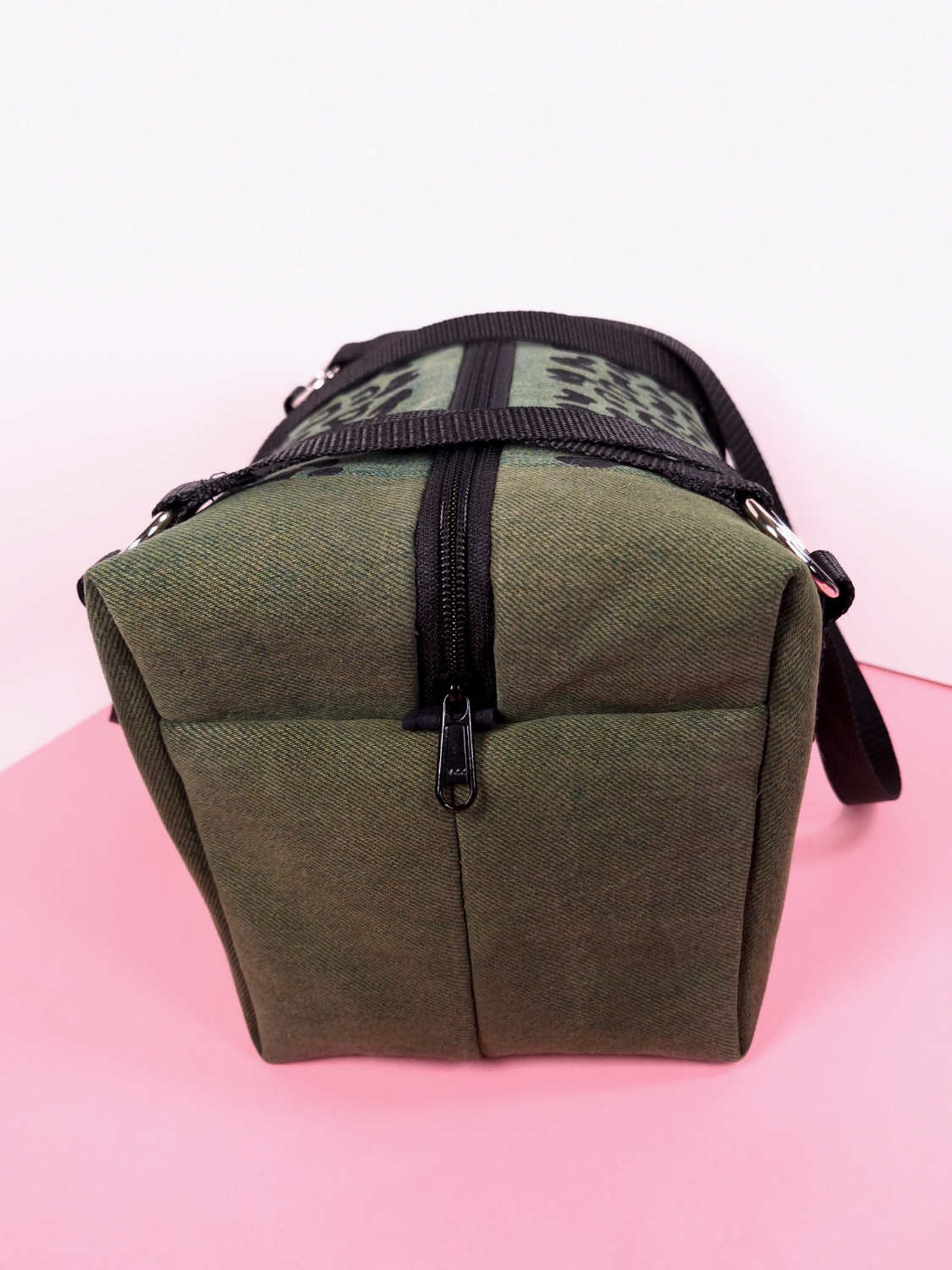 Laukun molemminpuolin on pantterikuosia, joka on painettu käsin kankaanpainoseulalla mustalla kangasvärillä.