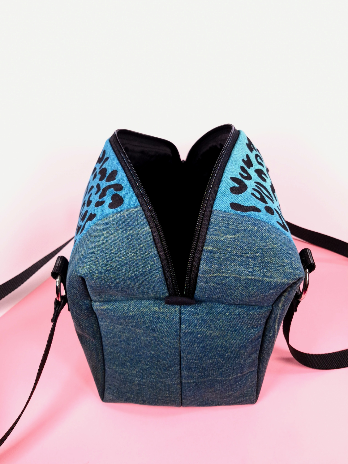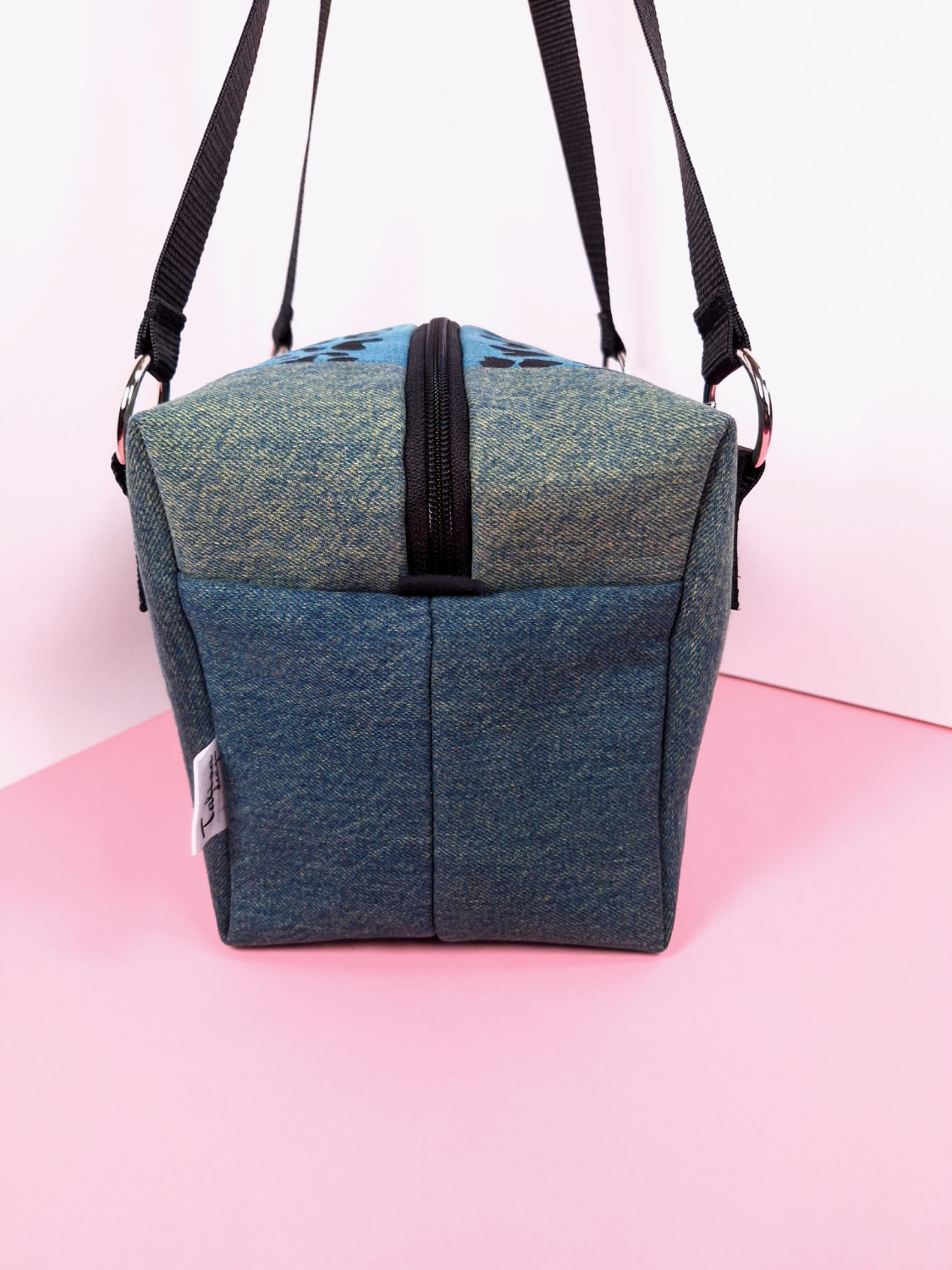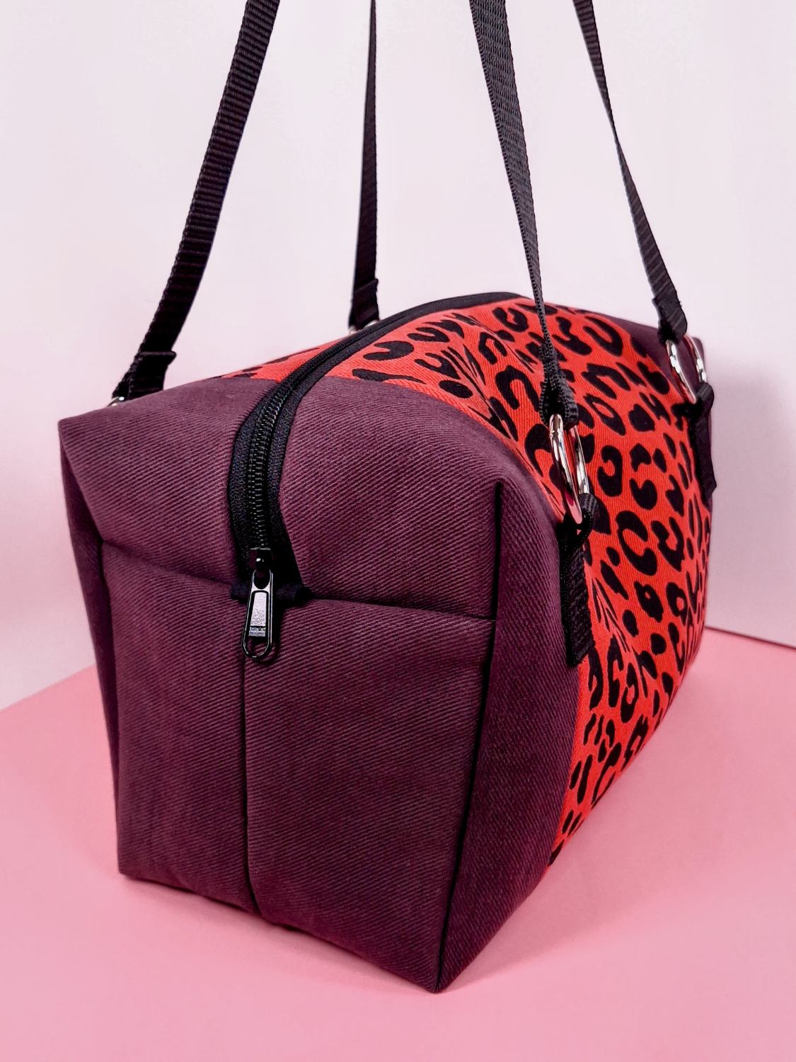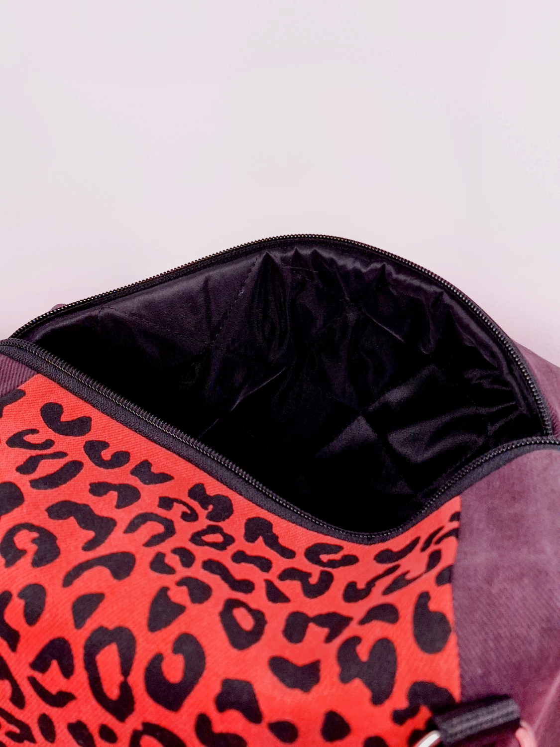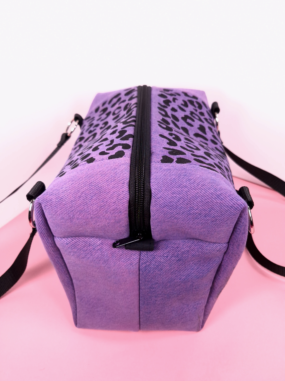 Laukun molemminpuolin on pantterikuosia, joka on painettu käsin kankaanpainoseulalla mustalla kangasvärillä.