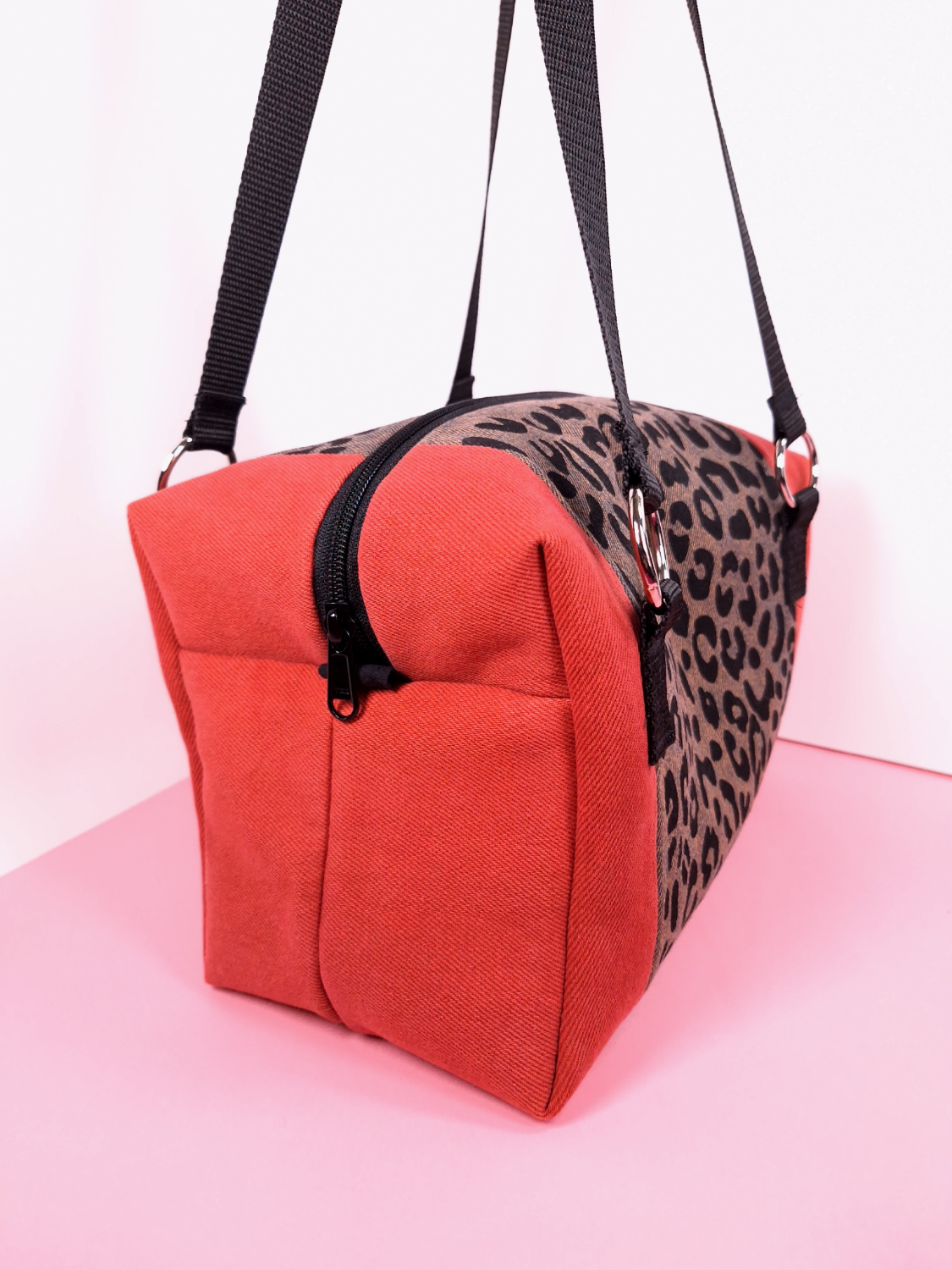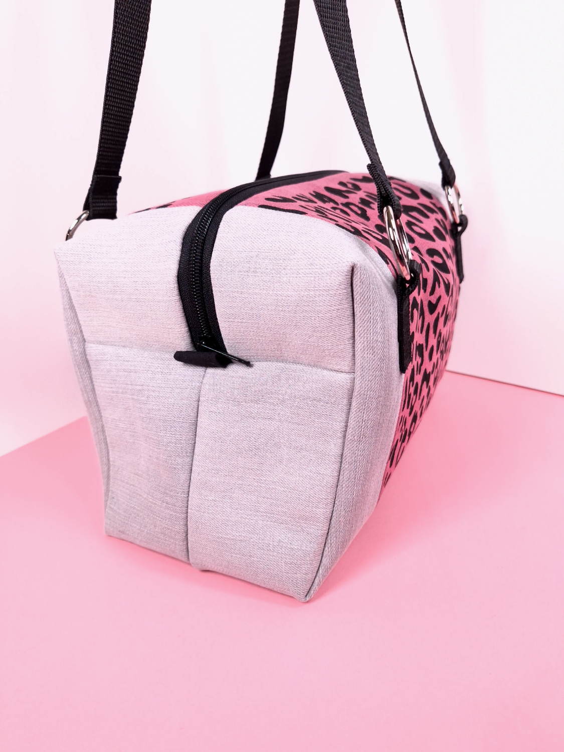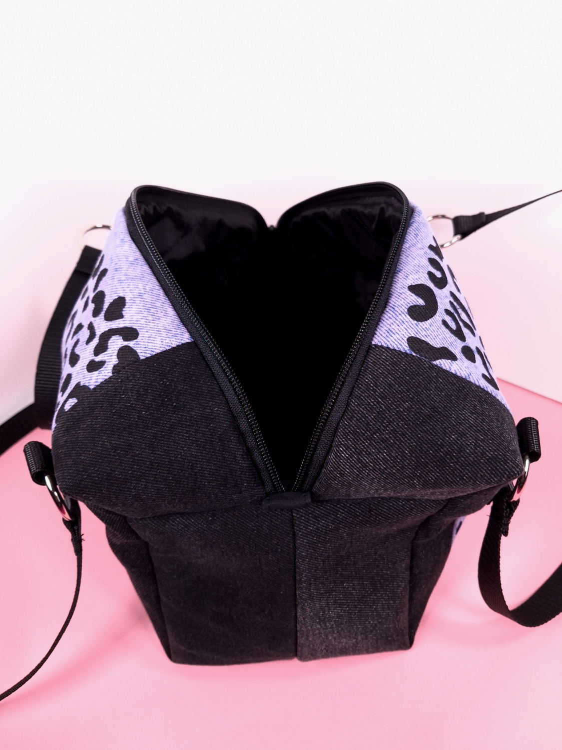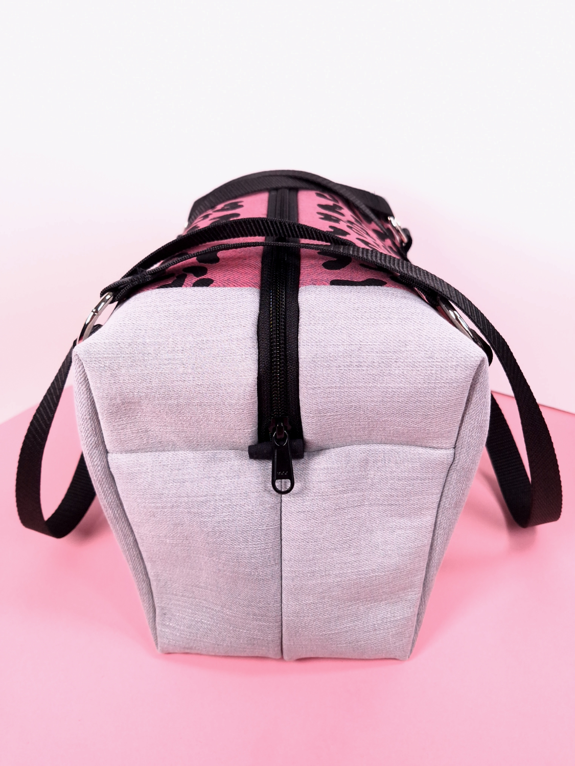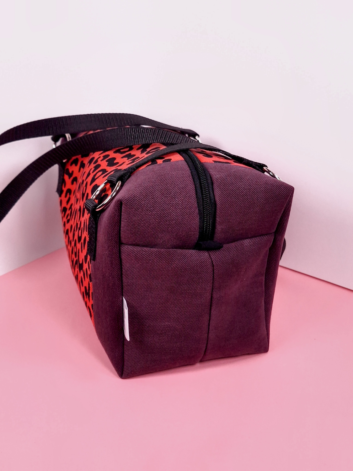 Laukun molemminpuolin on pantterikuosia, joka on painettu käsin kankaanpainoseulalla mustalla kangasvärillä.