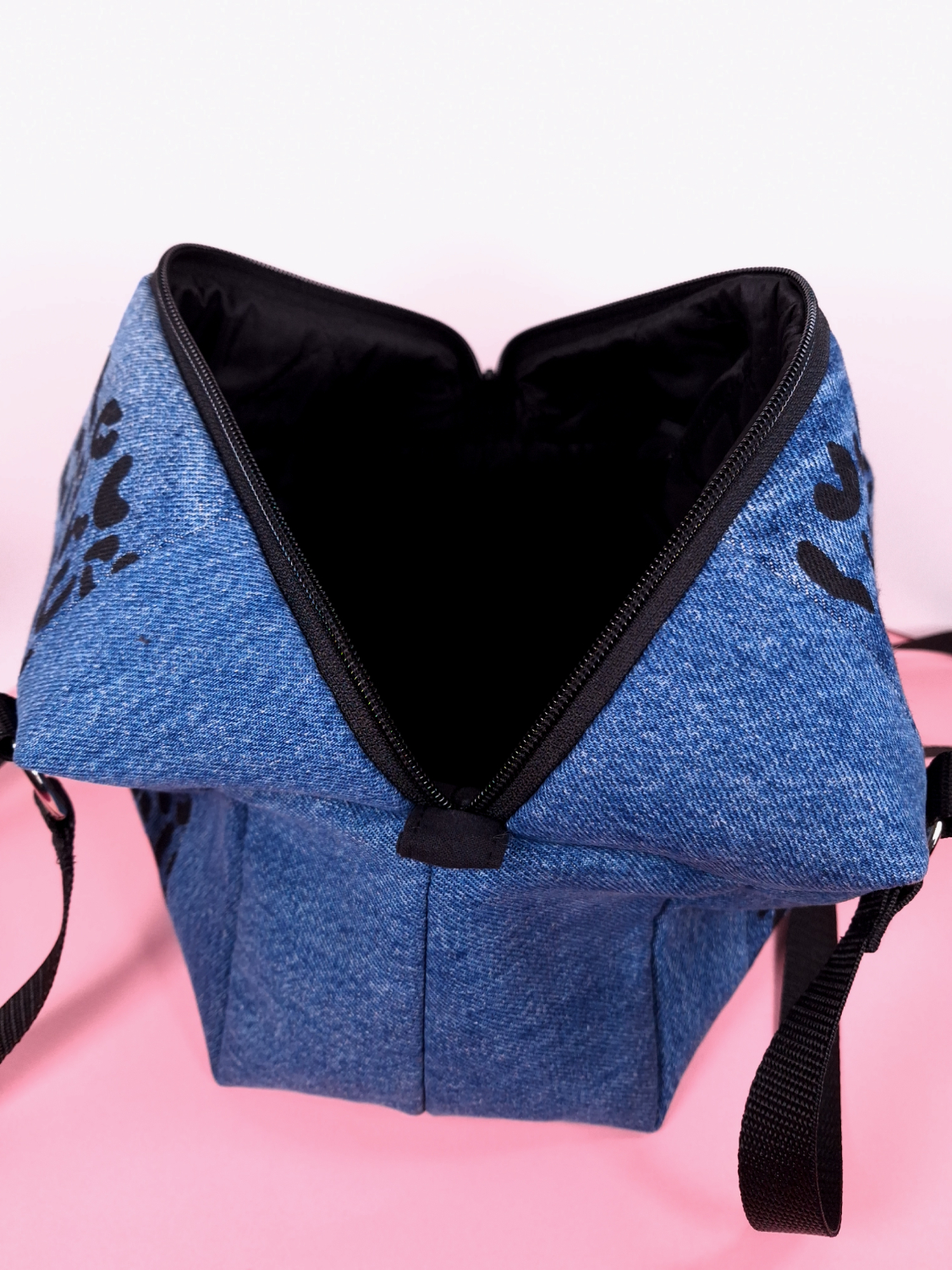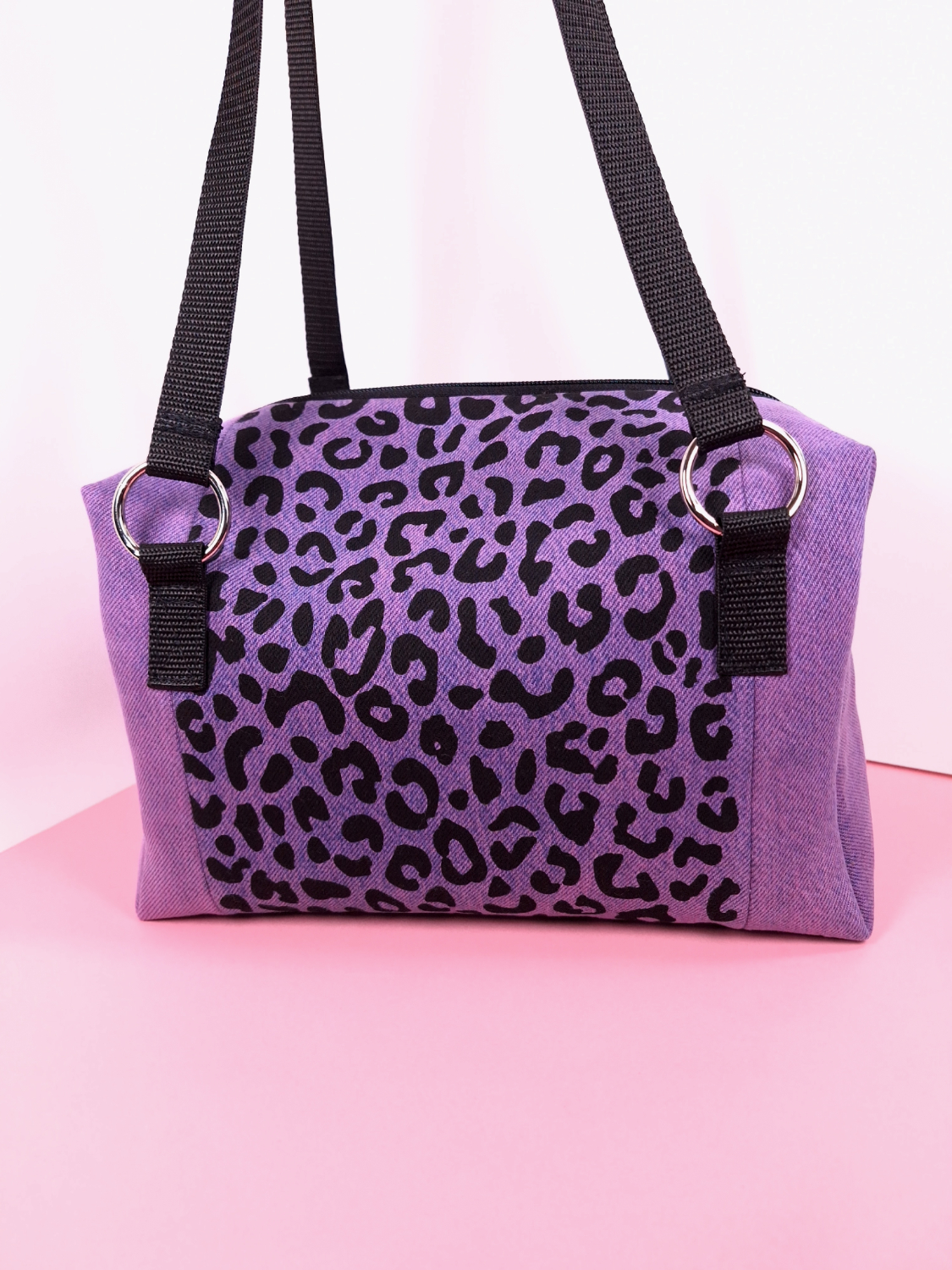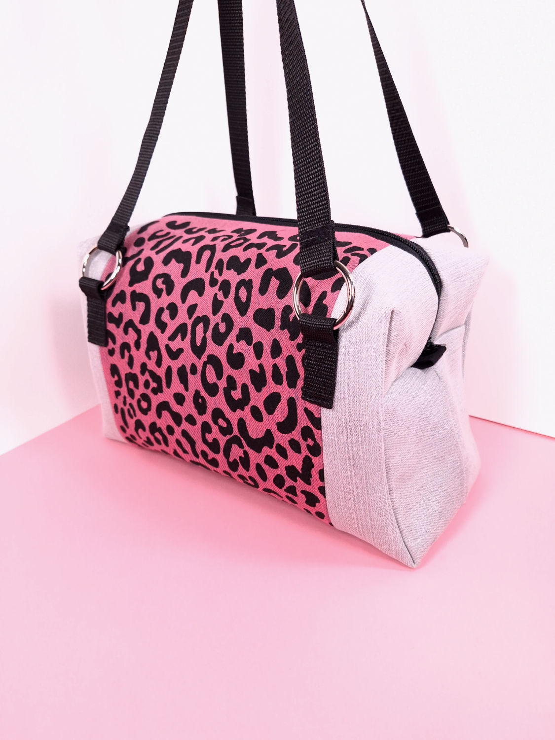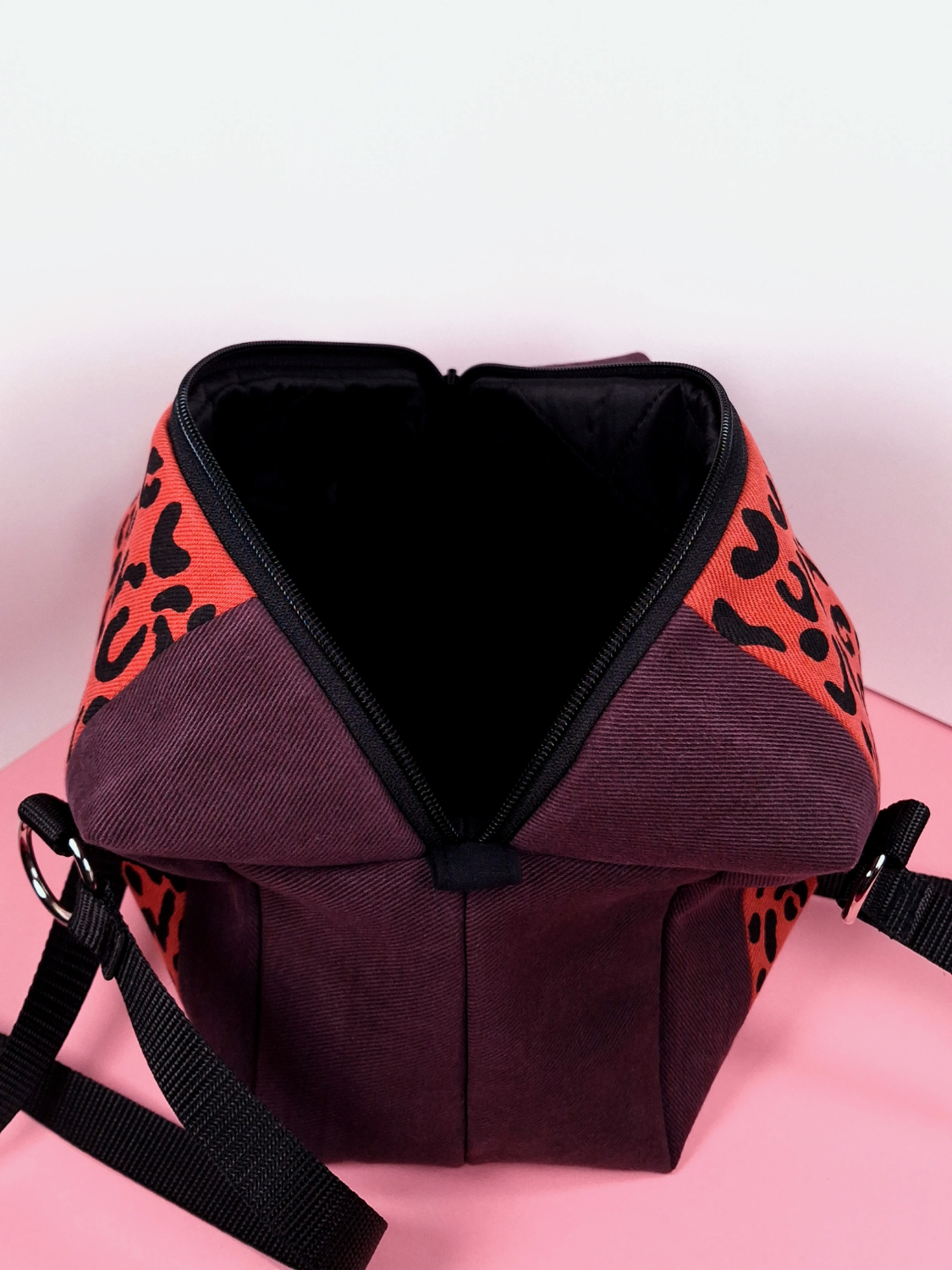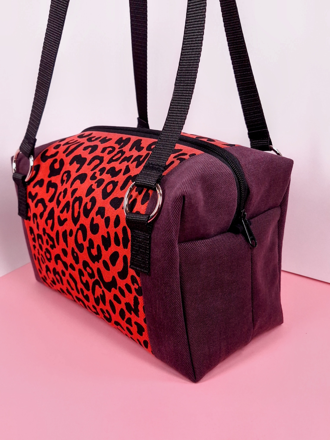 Laukun molemminpuolin on pantterikuosia, joka on painettu käsin kankaanpainoseulalla mustalla kangasvärillä.
