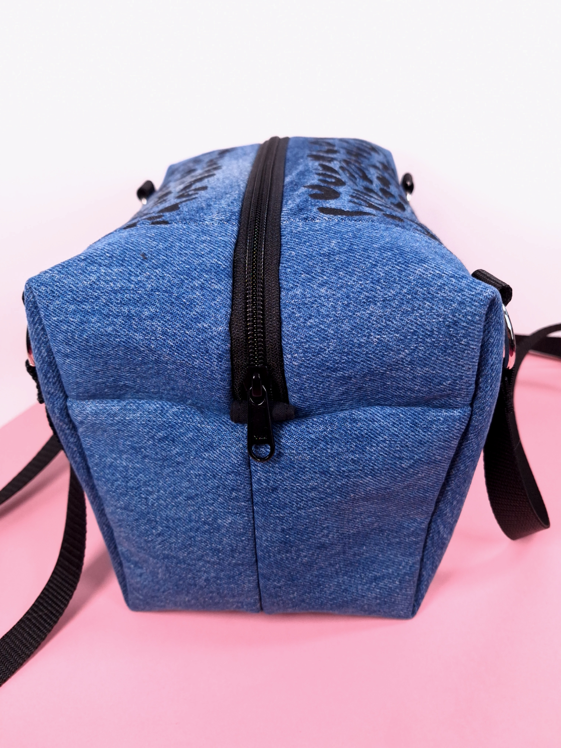Päällinen kierrätysfarkkua, joka on tuettu jämäkällä tukivanukankaalla.