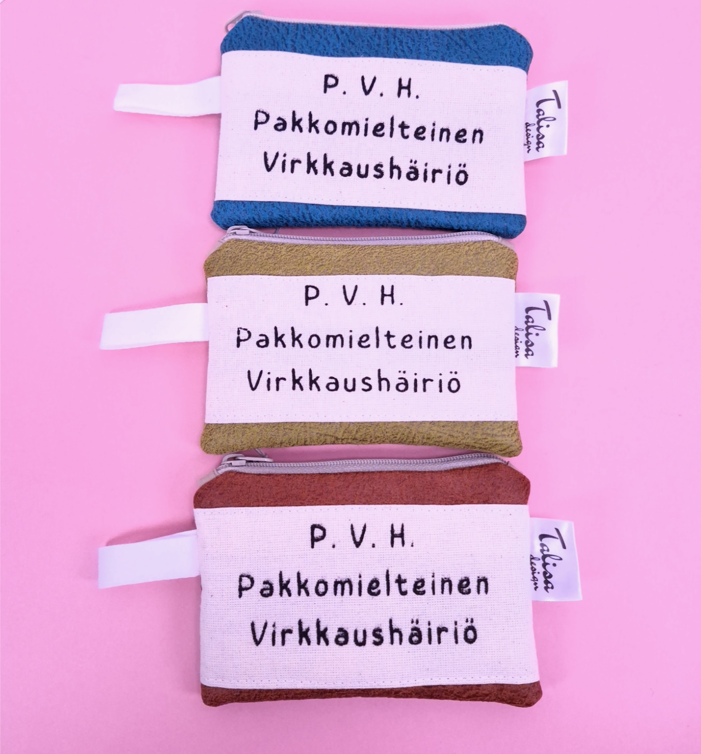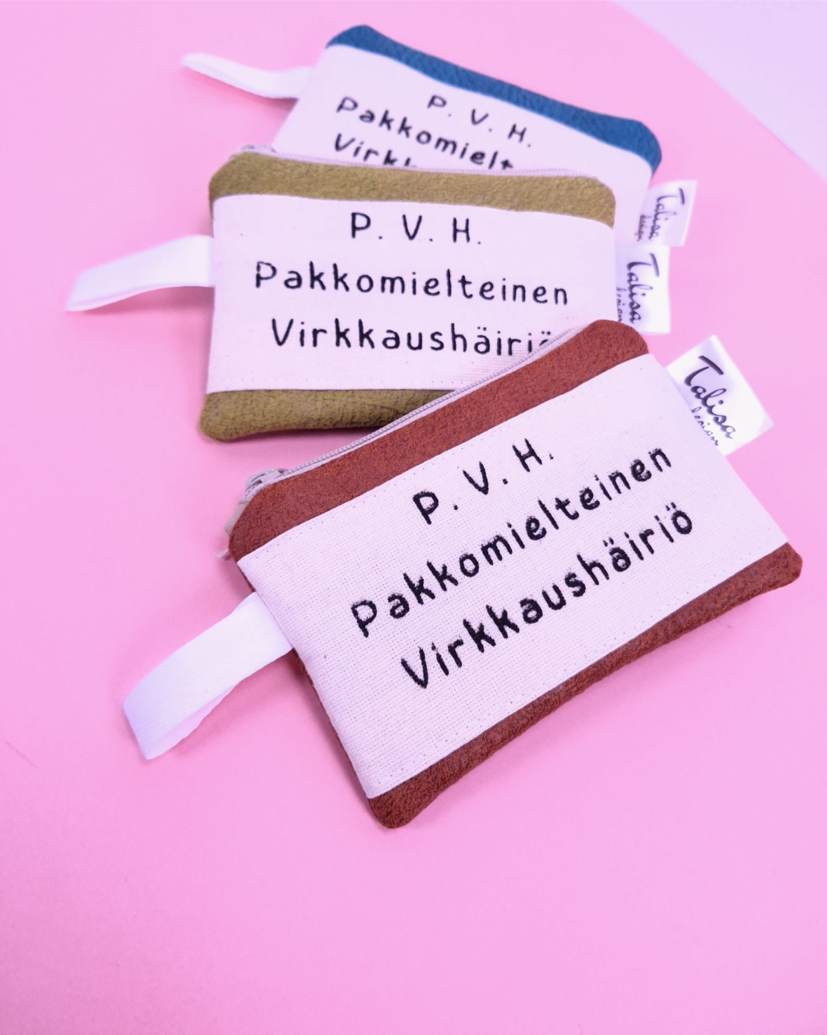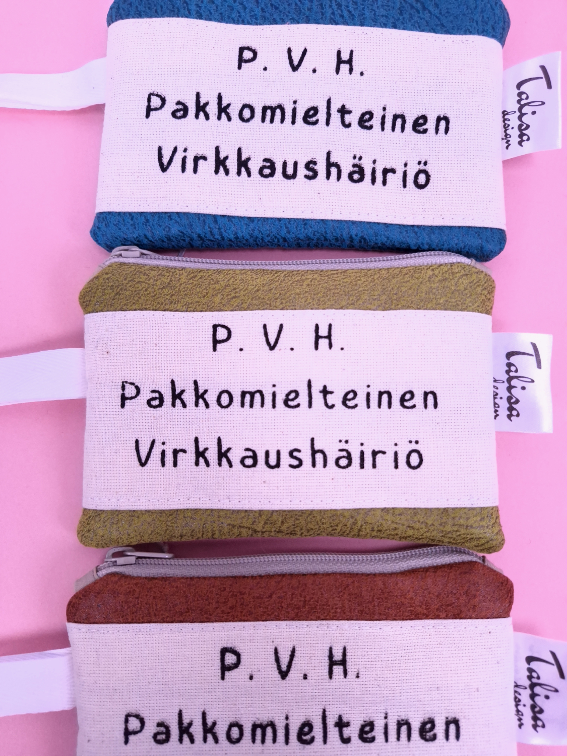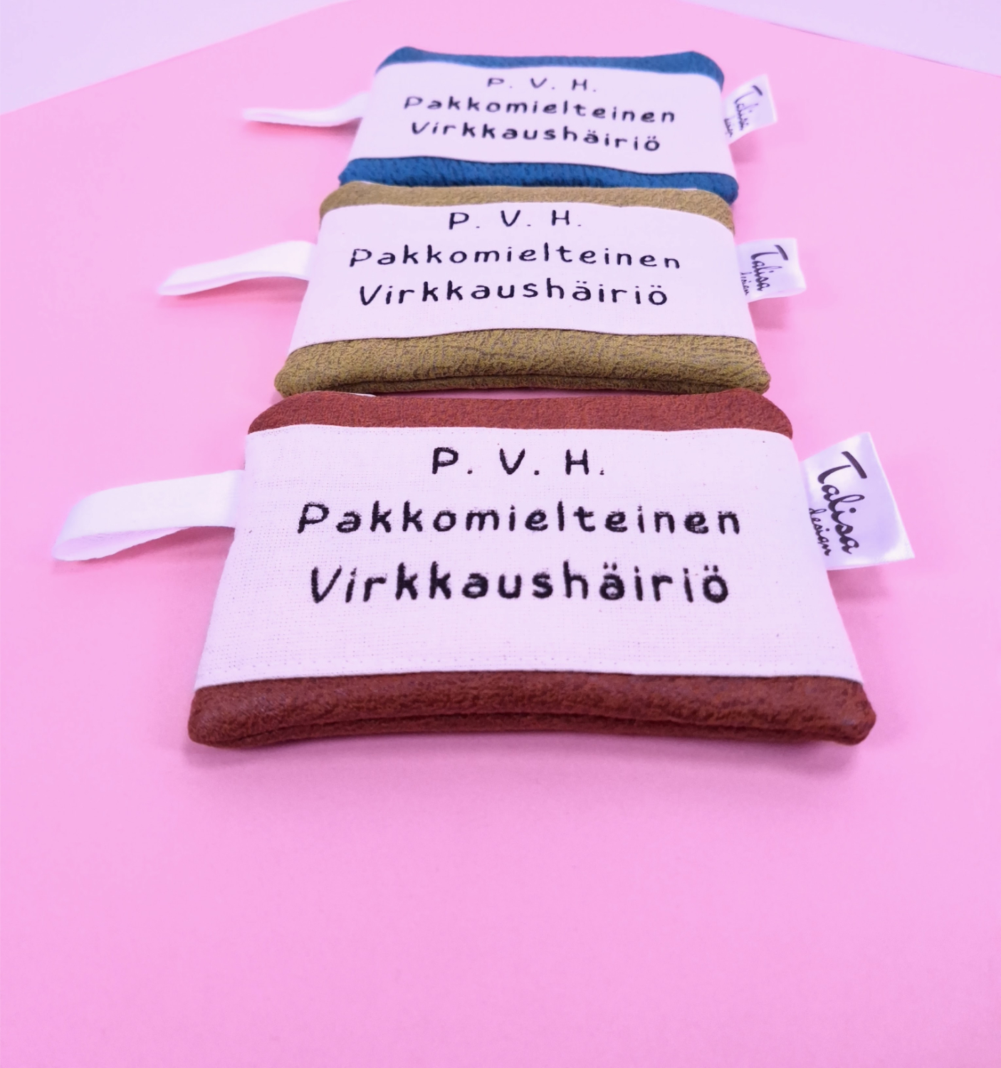 • Päällinen: verhoomon ylijäämäkangasta, johon päällitikattu tekstikangas. “P. V. H. Pakkomielteinen virkkaushäiriö.”